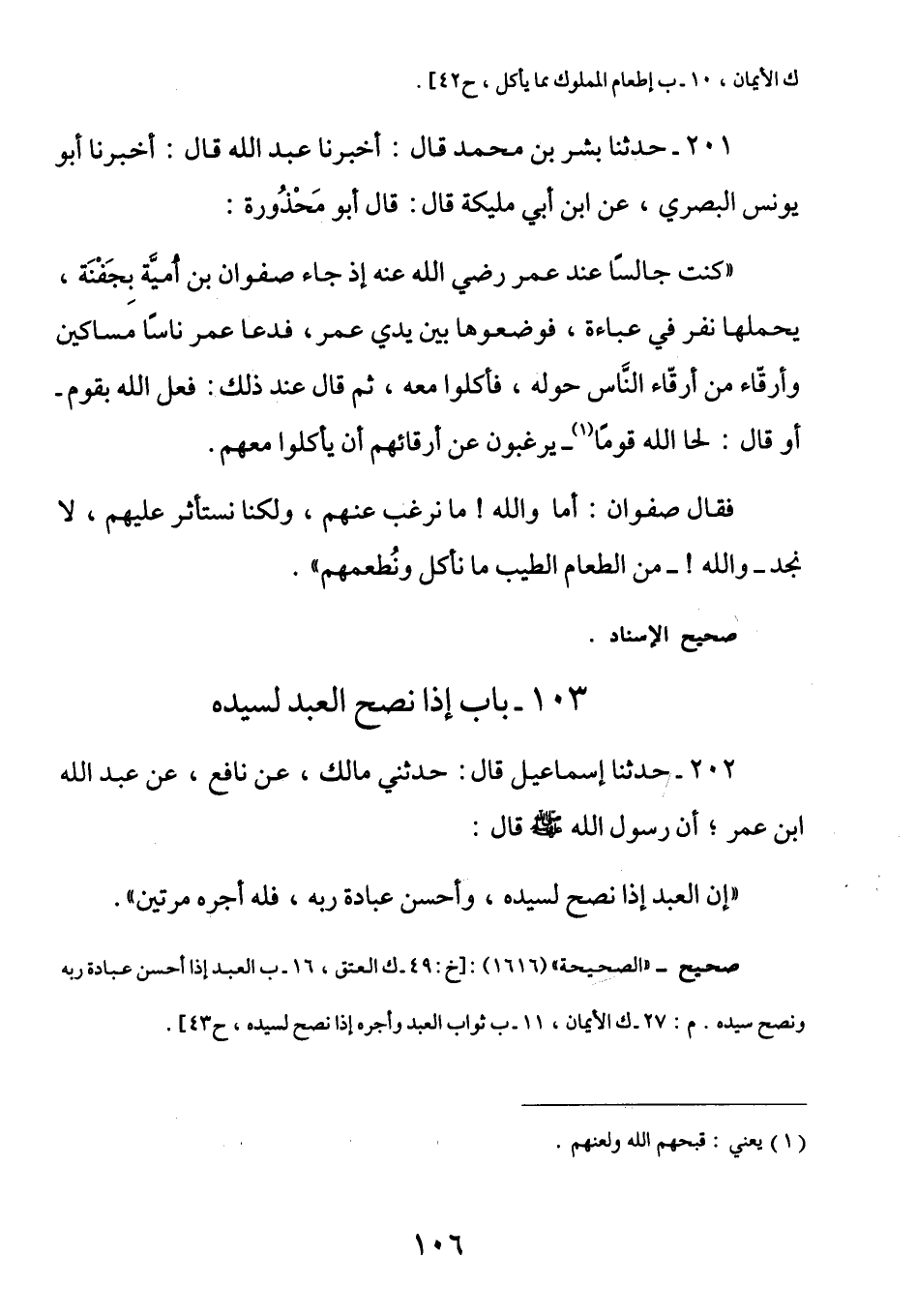 202 - عن عبد الله بن عمر رضي الله عنهما أن رسول الله صلى الله عليه وسلم قَالَ: إِنَّ العبْدَ إِذَا نصحَ لسيدهِ وأحسنَ عبادة ربه له أجرهُ مرَّتين)