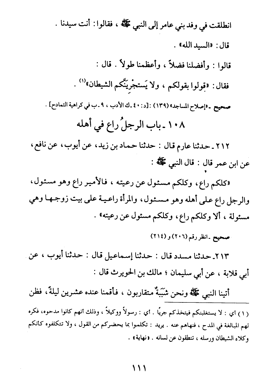 211 - عن عبد الله بن الشخير قال: انْطَلَقْتُ فِي وَفْدِ بَنِي عَامِرٍ إِلَى النَّبِيِّ صَلَّى اللهُ عَلَيْهِ وَسَلَّمَ فَقَالُوا: أَنْتَ سَيِدُنا قَالَ: (السيِدُ اللَّهُ) قَالُوا: وأفضَلُنا فَضْلا وأعَظَمُنا طَوْلا، قال: (قُولُوا بِقَوْلِكُم ولا يَسْتَجْرِينَّكُم الشيطان)