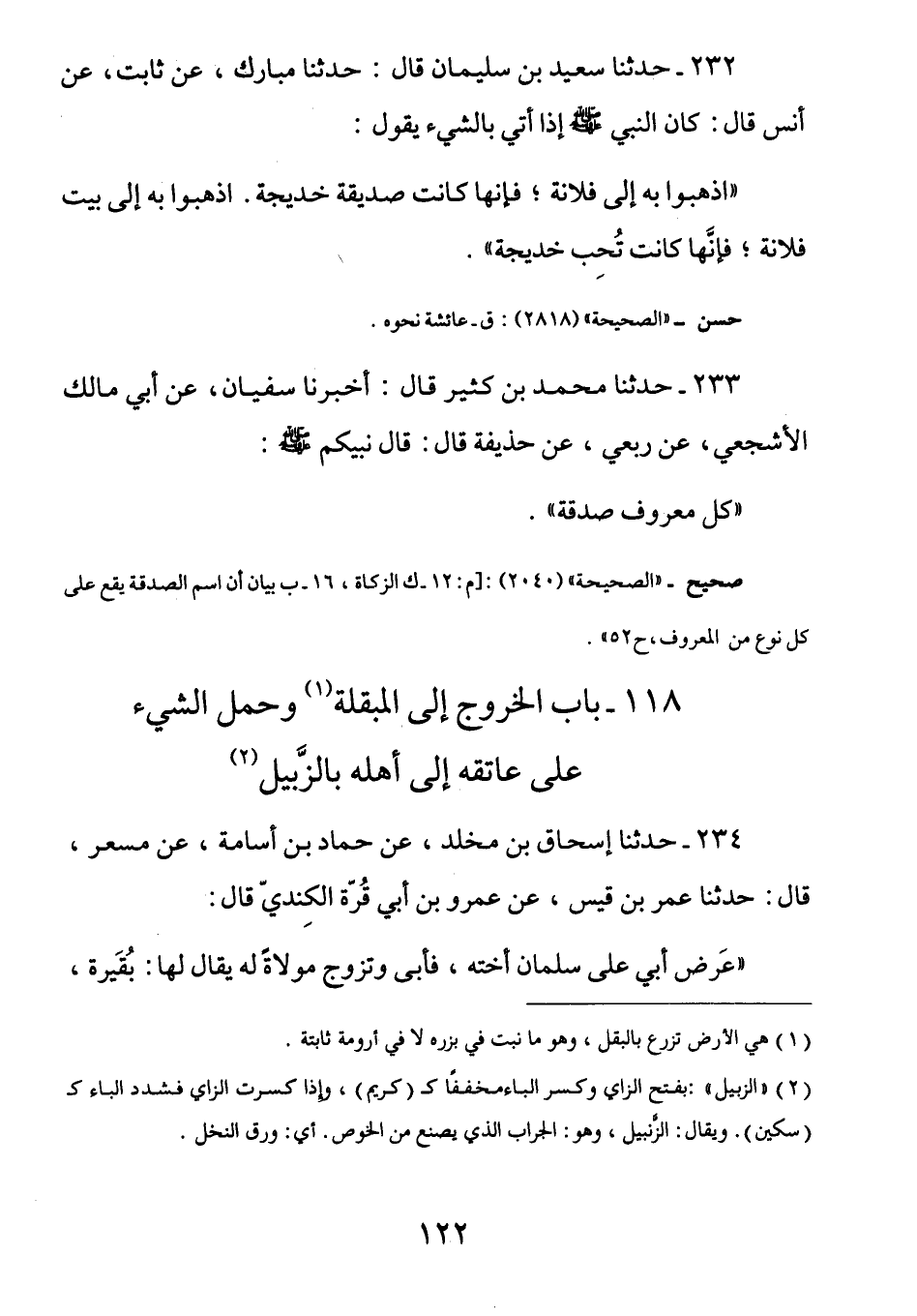 232 - عن أنس رَضِيَ اللَّهُ عَنْهُ قَالَ: كَانَ النَّبِيُّ صَلَّى اللهُ عَلَيْهِ وَسَلَّمَ إِذَا أُتِيَ بالشَّيء يَقُولُ: (اذْهَبُوا بِه إِلَى فُلانَةٍ فَإنَّها كَانَت صَدِيقةُ خَدِيْجةَ. اذْهَبُوا بِه إلى فُلانَةٍ فَإنَّها كانت تُحِبُّ خَدِيّجةَ)
