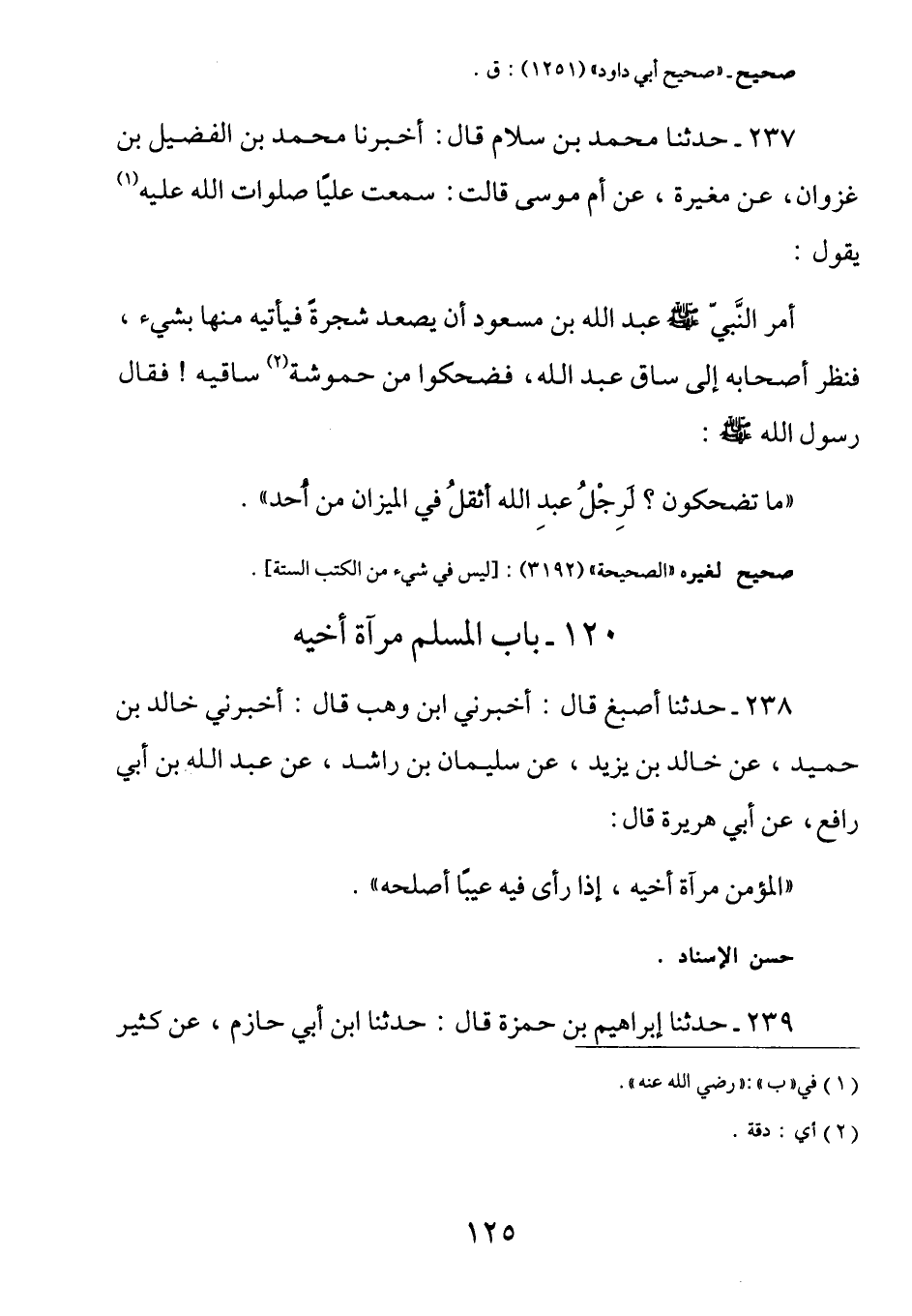 237 - عن علي رضي الله عنه قَالَ: أَمَرَ النَّبِيُّ صَلَّى اللهُ عَلَيْهِ وَسَلَّمَ عبدَ اللَّهِ بْنَ مَسْعُودٍ أَنْ يَصْعَدَ شَجَرة فَيَأتِيَه مِنْها بِشَيْءٍ فنَظر أصحابُه إِلَى سَاق عَبْدِ اللَّهِ فَضَحِكوا مِنْ حُمُوشةِ (¬1) سَاقيه فَقَالَ رَسُولُ اللَّهِ صَلَّى اللهُ عَلَيْهِ وَسَلَّمَ: (ما تَضْحَكُون لَرِجْلُ عَبْدِ اللَّهِ أثقَلُ فِي المِيْزَان من أُحدٍ)