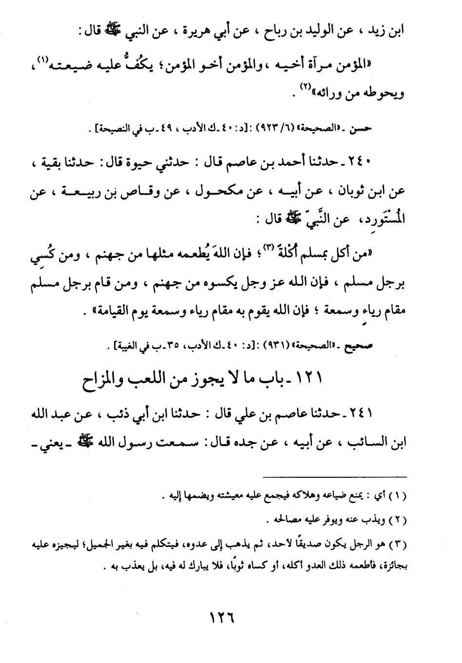 239 - عَنْ أَبِي هُرَيْرَةَ رَضِيَ اللَّهُ عَنْهُ عَنِ النَّبِيِّ صَلَّى اللهُ عَلَيْهِ وَسَلَّمَ قَالَ: (المُؤمن مرآةُ أخِيه، وَالْمُؤْمِنُ أَخُو المؤمنِ، يَكفُّ عَلَيْهِ ضَيْعَتَه (¬1) ويحُوطُه مِن وَرَائِهِ)