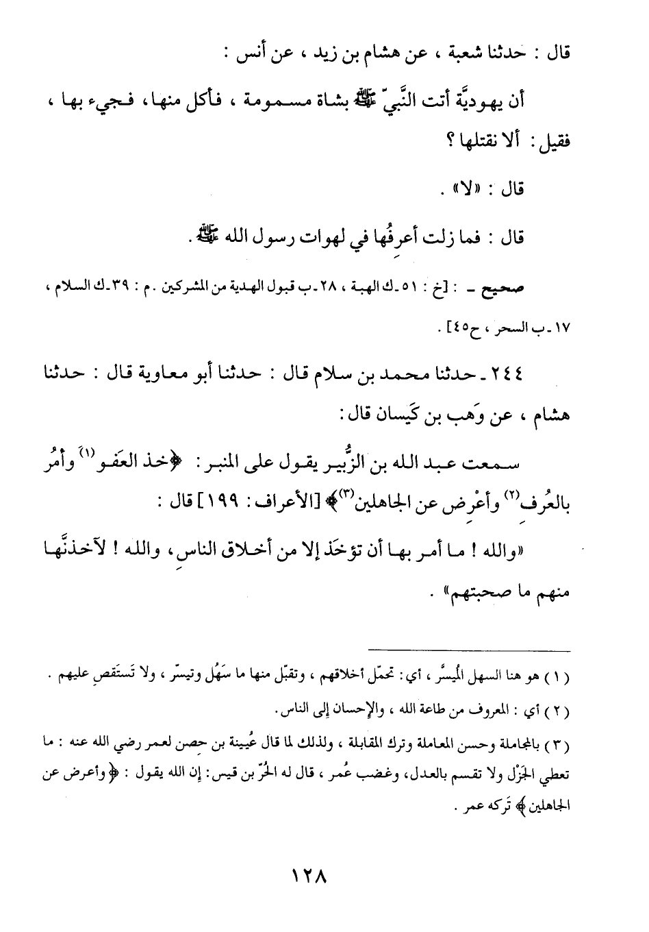 244 - (ث59) عَنْ وَهْبِ بْنِ كَيْسَانَ قَالَ: سَمِعْتُ عَبْدَ اللَّهِ بْنَ الزُّبَيْرِ يَقُولُ: عَلَى الْمِنْبَرِ (خُذِ الْعَفْوَ وَأْمُرْ بِالْعُرْفِ وَأَعْرِضْ عَنِ الْجَاهِلِينَ) (¬2) قَالَ: وَاللَّهِ مَا أَمَر بِهَا أَنْ تُؤخَذ إِلَّا مِن أَخْلاق النَّاس , وَاللَّهِ لآخُذَنَّها مِنْهم مَا صَحِبْتُهم.