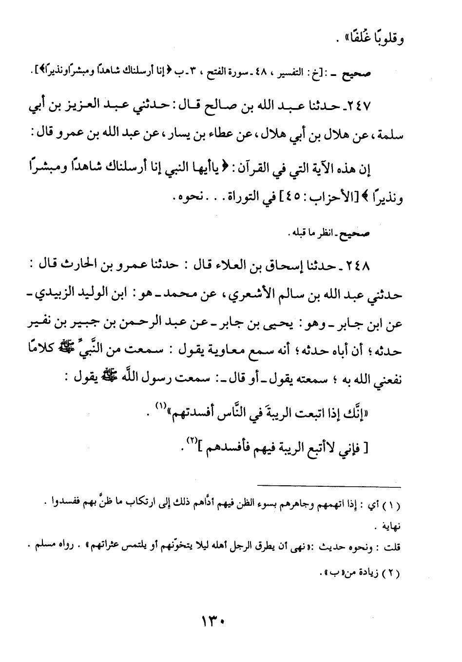 248 - عن معاوية رضي الله عنه قَالَ: سَمِعْتُ مِنَ النَّبِيِّ صَلَّى اللهُ عَلَيْهِ وَسَلَّمَ كَلَامًا نَفَعَنِي اللَّهُ بِهِ سَمِعتُه يَقُولُ: - أَوْ- قَالَ: سَمِعْتُ رَسُولَ اللَّهِ صَلَّى اللهُ عَلَيْهِ وَسَلَّمَ - يقولُ: (إنَّكَ إِذَا اتَّبَعتَ الرِّيبَةَ في النَّاس أَفْسَدْتَهُم) فإنِي لا أَتَّبِعُ الربية فِيهم فأُفْسِدُهُم.
