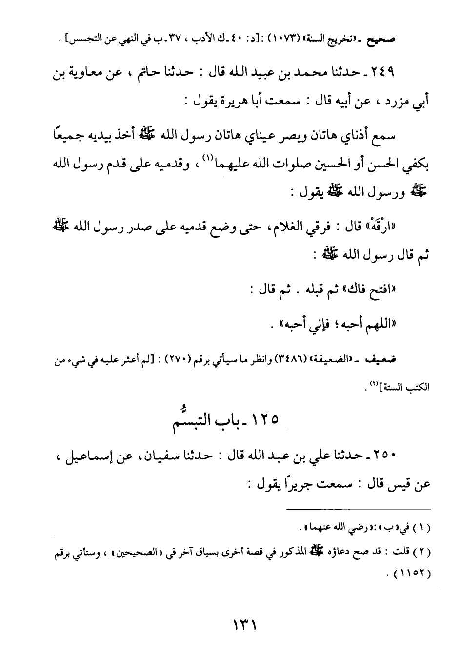 249 - عن أبي هريرة رضي الله عنه قال: سَمِعَ أُذُنَايَ هَاتَان وبَصَر عَيْنَايَ هَاتَان رَسُولَ اللَّهِ صَلَّى اللهُ عَلَيْهِ وَسَلَّمَ أَخَذَ بِيديهِ جَمِيعًا بِكَفَّيِّ الْحَسَنِ أَوِ الْحُسَيْنِ - صَلَوَاتُ اللَّهِ عَلَيْهِمَا - وقَدَمَيْه عَلَى قَدَم رَسُولِ اللَّهِ صَلَّى اللهُ عَلَيْهِ وَسَلَّمَ، وَرَسُولُ اللَّهِ صَلَّى اللهُ عَلَيْهِ وَسَلَّمَ يَقُولُ: (ارْقَهْ) قَالَ: فَرَقَى الغُلامُ حَتَّى وضَعَ قَدَمَيْه عَلَى صَدر رَسُولِ اللَّهِ صَلَّى اللهُ عَلَيْهِ وَسَلَّمَ ثُمَّ قَالَ رَسُولُ اللَّهِ صَلَّى اللهُ عَلَيْهِ وَسَلَّمَ: (افْتَح فَاكَ) ثُمَّ قَبَّلَه ثُمَّ قَالَ: (اللَّهُمَّ أَحِبَّهُ) فَإِنِّي أحبه.