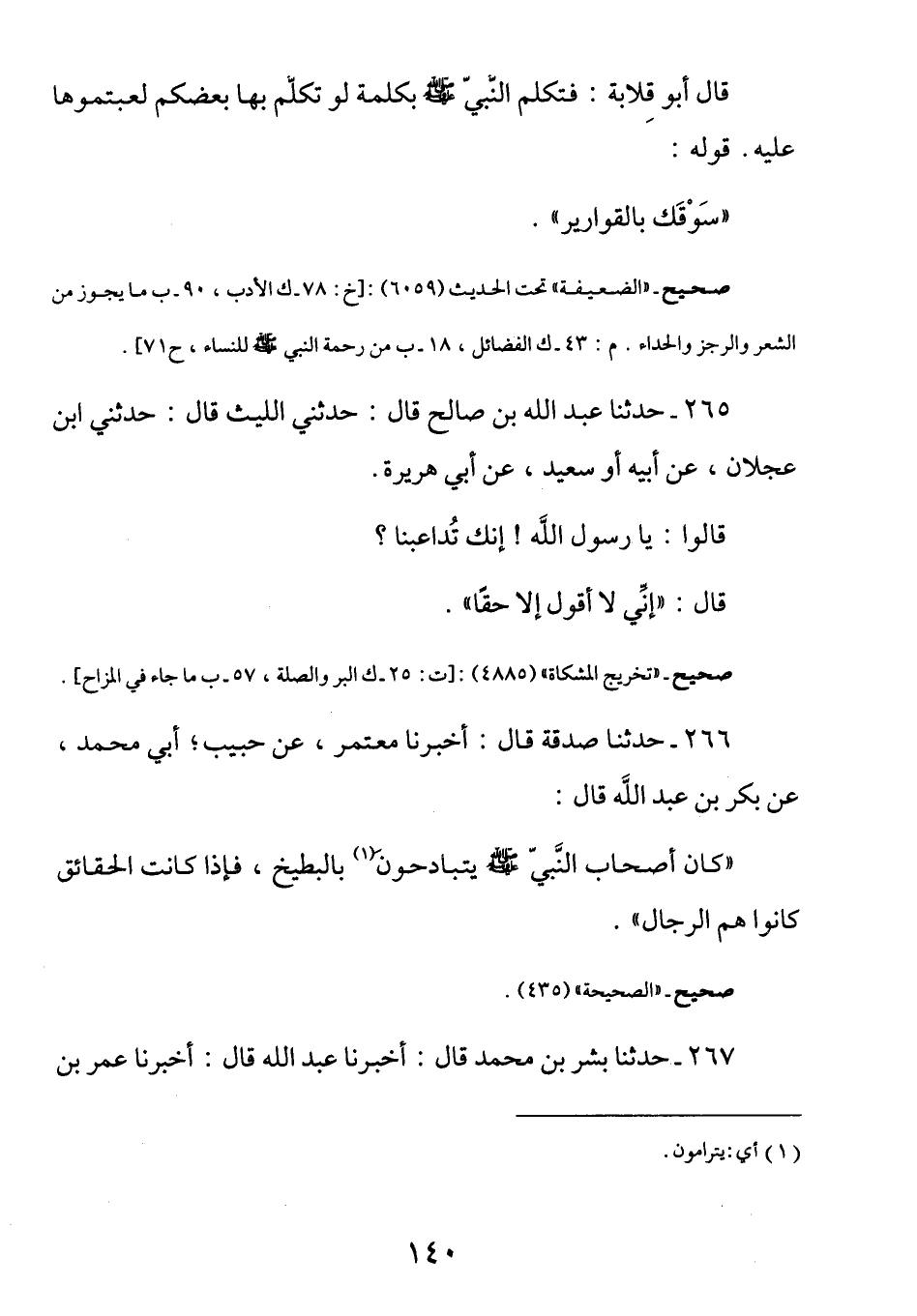 265 - عن أبى هريرة رضي الله عنه قال: قَالُوا: يَا رَسُولَ اللَّهِ إِنَّك تُدَاعِبُنا. قَالَ: (إِنَّي لا أَقُولُ إِلا حَقَّاً)