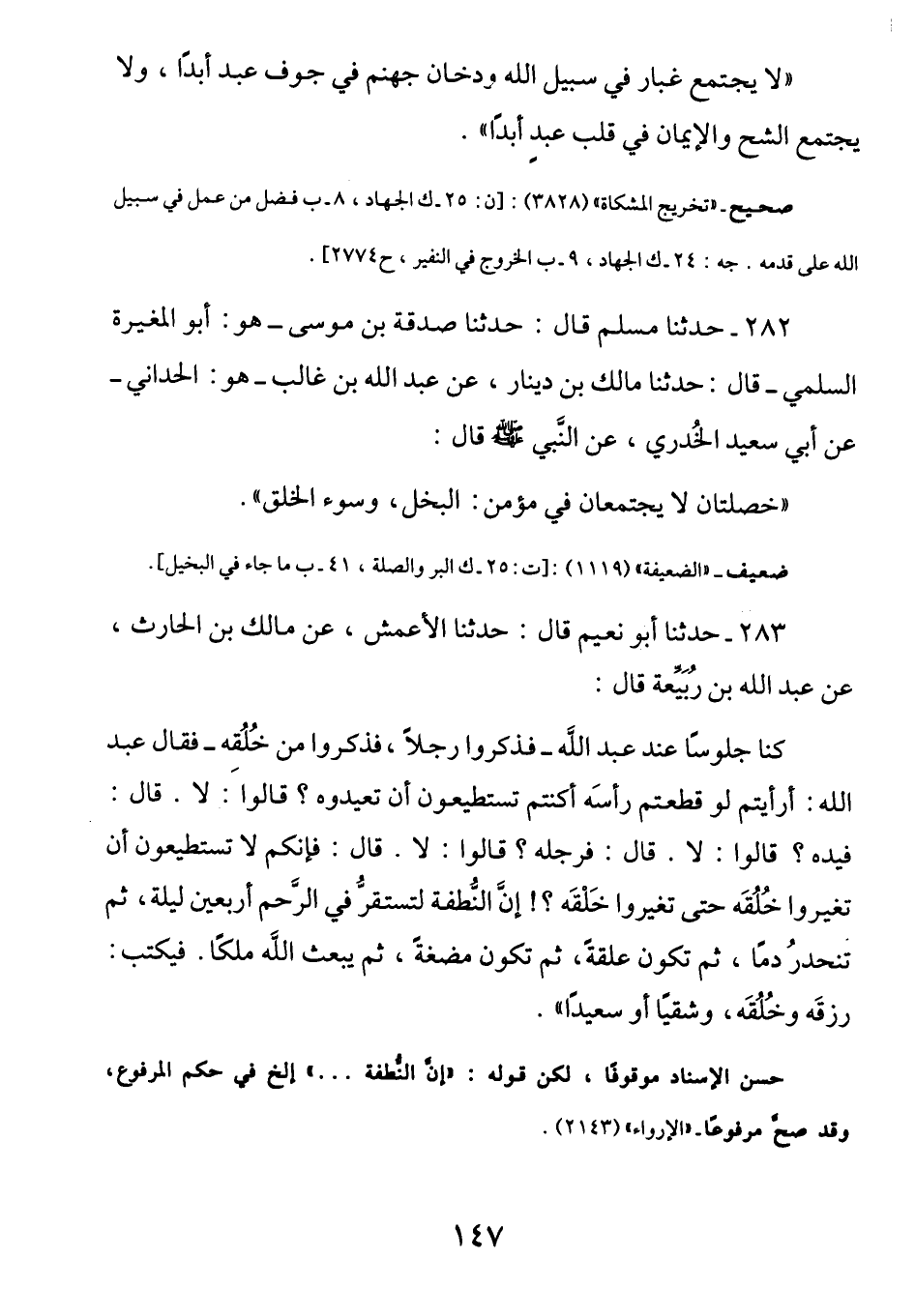 283 - (ث68) عَنْ عَبْدِ اللَّهِ بْنِ رَبِيعَةَ قَالَ: كُنَّا جُلوسَاً عِنْدَ عَبْدِ اللَّهِ، فَذَكروا رجُلاً فَذكروا مِن خُلُقِهِ فَقَالَ عَبدُ اللَّهِ: أَرأَيتُم لَوْ قَطعتُم رأسَهُ أكُنْتُم تَستَطِيعُونَ أَنْ تُعِيدُوه؟ قَالُوا: لَا، قَالَ: فِيِدِهُ؟ قَالُوا: لَا. قَالَ: فَرِجَلُهُ؟ قَالُوا: لَا. قَالَ: فَإِنَّكُم لَا تَستَطِيعُونَ أَن تُغيِّرُوا خُلُقَهُ حَتى تُغَيِّروا خَلْقَهُ. إنَّ النُّطْفَةَ لَتَستَقِرُ فِي الرَّحِم أَربَعِينَ لَيْلَةً، ثُم تَنحَدِرُ دَمًا، ثُمَّ تَكُونُ عَلَقَةً، ثُمَّ تكونُ مُضغَةً، ثُمَّ يَبعثُ اللَّهُ مَلكاً فَيَكتُبَ رزقَهُ، وخُلُقَهُ، وشَقِياً، أَو سَعيداُ.