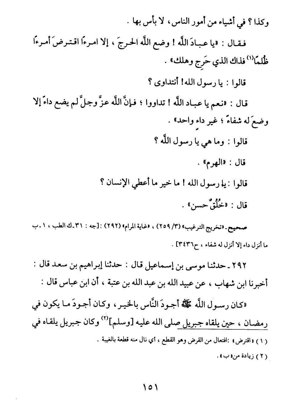 وكَذا؟ فِي أَشياءَ مِن أُمورِ النَّاس، لَا بَأسَ بِهَا، فَقَال: (يَا عِبادَ اللَّهِ وَضَعَ اللهُ الحَرجَ إِلَّا امرَءاً اقتَرَضَ امرَءاً ظُلمَاً (¬1) فَذَاكَ الَّذِي حَرج وَهَلك) قَالُوا: يَا رسولَ اللَّهِ أَنَتَداوَى؟ قَالَ: (نَعم يَا عِبادَ اللَّهِ تَدَاوَوْا فَإِنَّ اللهَ عَز وجلَّ لَم يَضَع دَاءً إِلَّا وَضَعَ لهُ شِفاءً غَير دَاءِ واحِدٍ) قالوا: ومَا هُو يَا رسولَ اللَّهِ؟ قَالَ: (الهَرمُ) قَالُوا: يَا رَسُولَ اللَّهِ، مَا خَيرُ مَا أُعطِى الإنْسَانُ؟ قال: (خُلُقٌ حَسَنٌ)