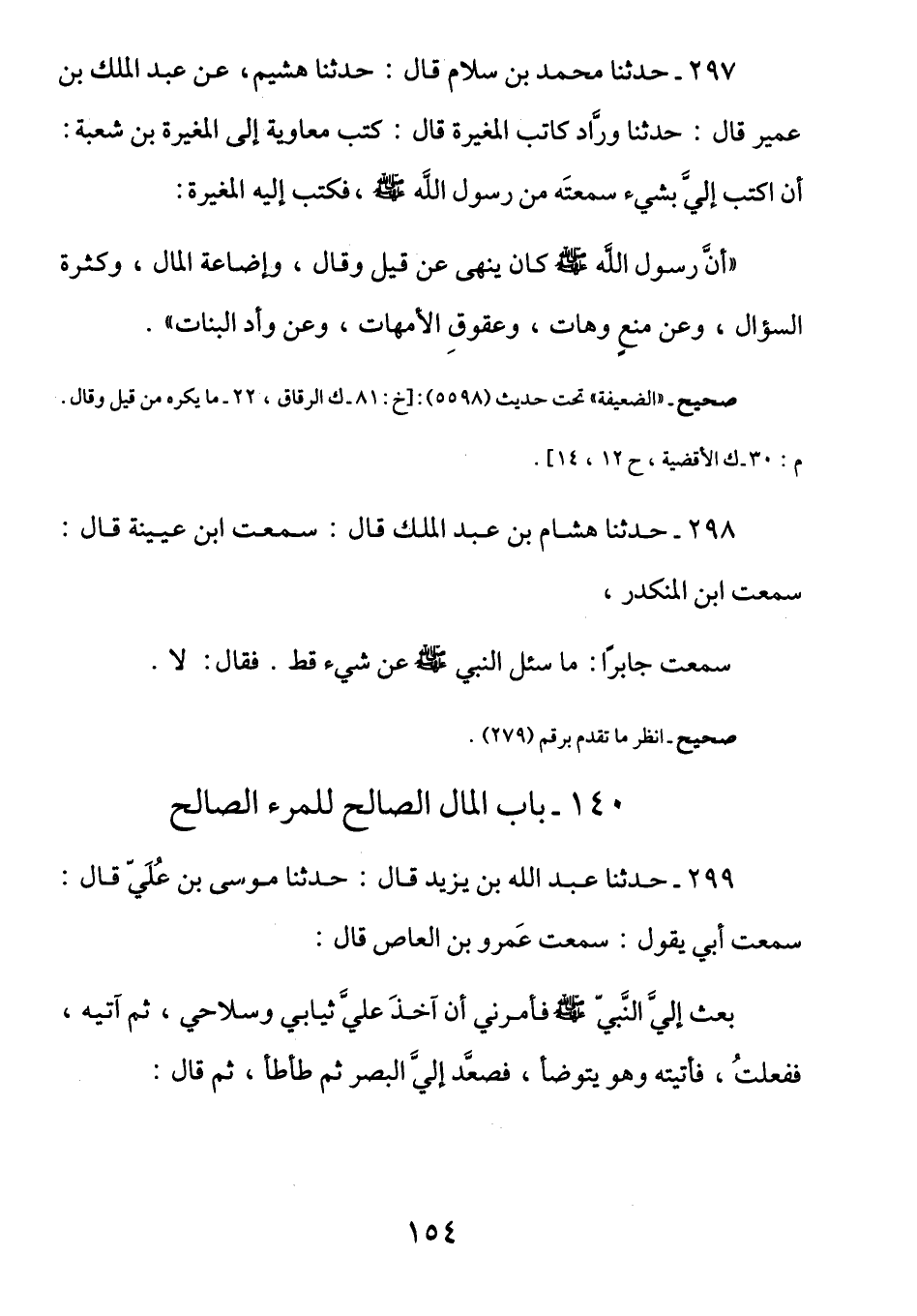 297 - عن المغيرة رَضِيَ اللَّهُ عَنْهُ أَنَّ رَسُولَ اللَّهِ صَلَّى الله عليه وسلم: كانَ يَنهَى عَن قِيلَ وقَالَ وإِضَاعَةِ المَالِ، وكَثرَةِ السُؤَال، وعَن مَنعٍ وهَاتِ، وعُقوقِ الأمَّهَاتِ، وعَن وَأدِ البَنَاتِ)
