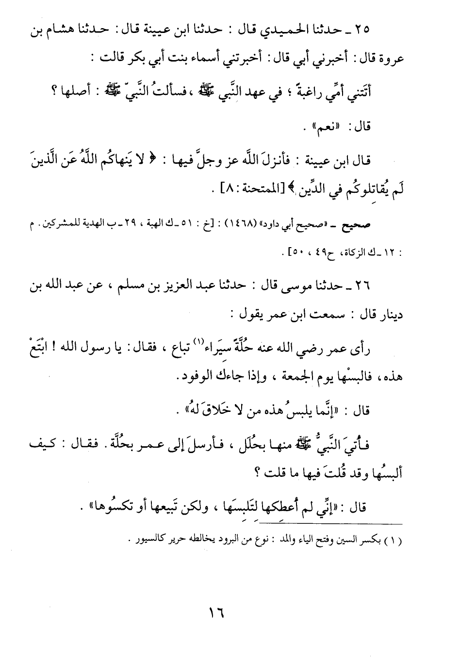 26 - عن ابن عمر رضي الله عنهما قال: رَأَى عُمَرُ رَضِيَ اللَّهُ عَنْهُ حُلَّةً سَِيَراءَ (¬2) تُبَاعُ،