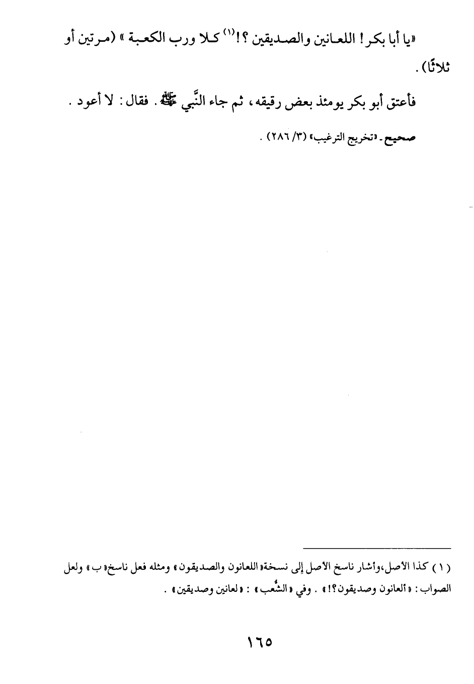 (يا أبا بَكرٍ اللَّعَانُون والصِّديقُون (¬1) . كَلَّا ورَبِ الكَعبَة) مَرتَين أَوْ ثَلَاثًا، فَأعتَق أبُو بَكر يَومئذٍ بَعضَ رَقِيقهِ، ثُم جَاء النبيَ صَلَّى اللهُ عَلَيْهِ وَسَلَّمَ فَقالَ: لَا أَعُود. َ