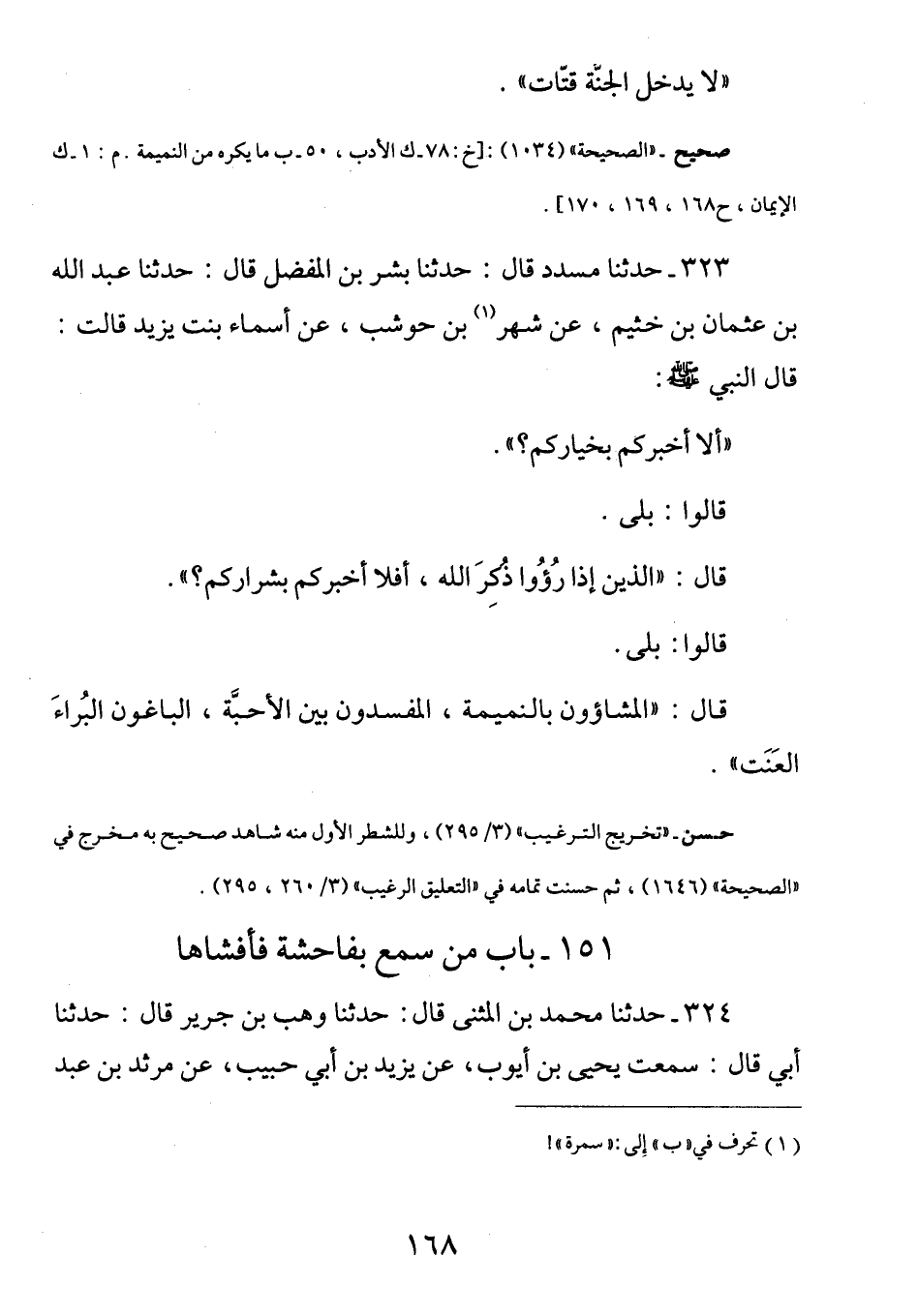 323 - عن أسماء بنت يزيد رضي الله عنها قَالَتْ: قَال النَبي صَلَّى اللهُ عَلَيْهِ وَسَلَّمَ: (أَلا أُخِبُركُم بِخِيَارِكُم؟) قَالُوا: بَلَى قَالَ: (الذينَ إِذَا رُؤوا ذُكِر اللَّهُ. أَفَلا أُخِبرُكُم بِشِرارِكُم؟) قَالوا بلى. قَال: (المَشاءوُن بِالنَمِيمَةِ المُفسِدُون بَينَ الأحِبةِ البَاغُون البُرَآءَ العَنَت) .