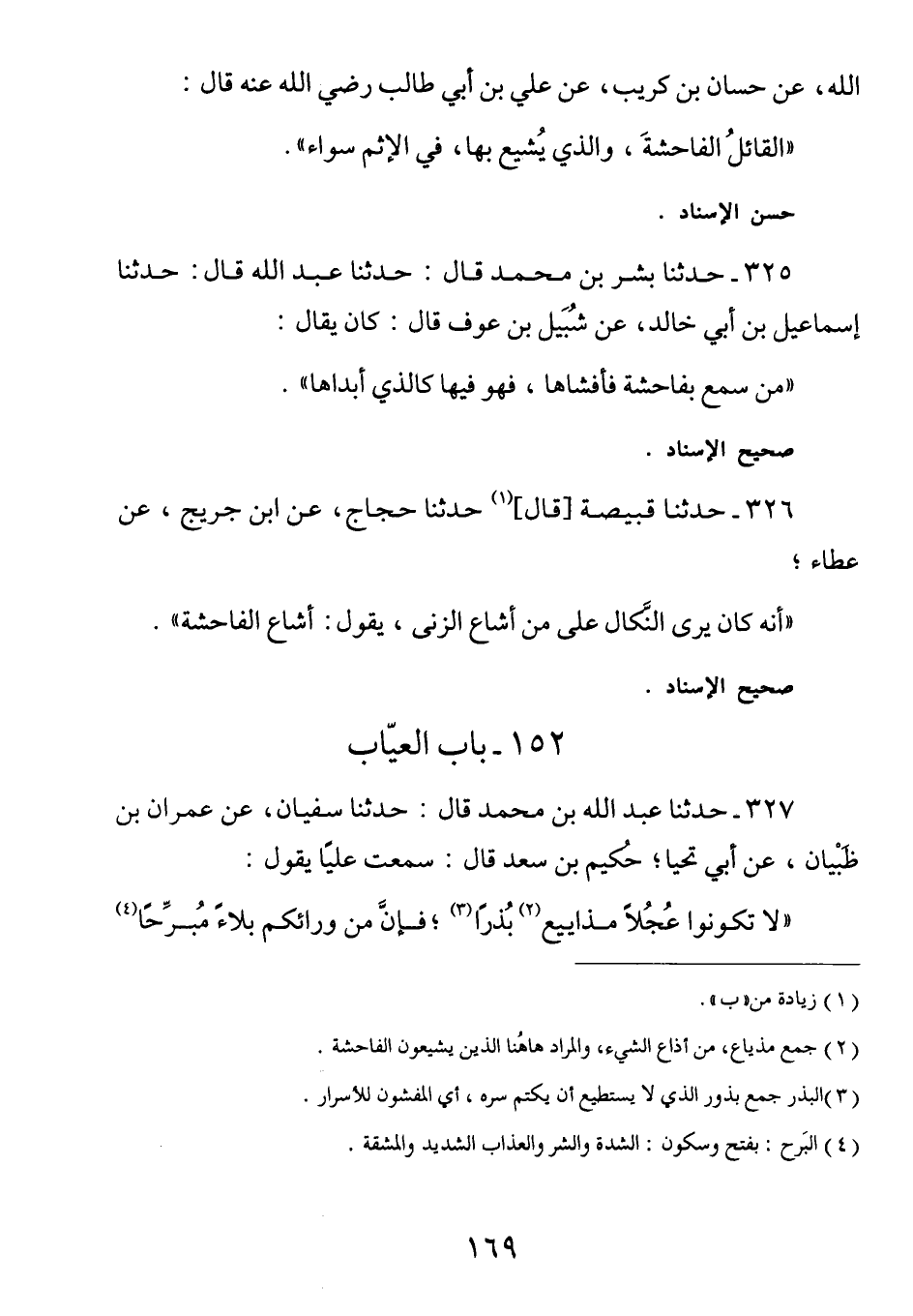 327 - (ث 78) عن علي رضي الله عنه قال: لَا تَكُونُوا عُجُلاً مَذاييعَ بُذُرَاً (¬1) فَإن مِن وَرائِكُم بَلاءً مُبْرَحَاً (¬2)