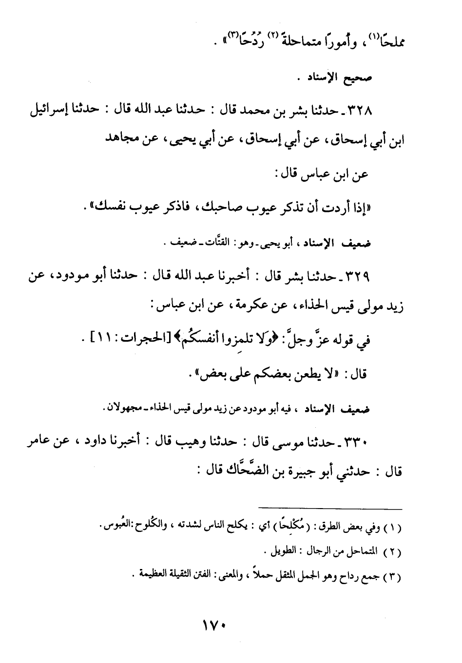 328 - (ث 79) عن ابن عباس رضي الله عنهما قَالَ: إِذا أَردتَ أنْ تَذكُرَ عُيوبَ صَاحِبكَ، فَاذكُر عُيوبَ نَفسِك.