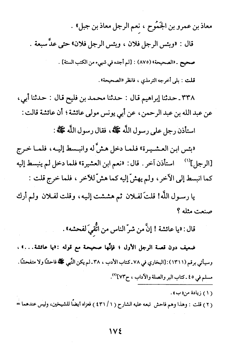 338 - عَنْ عَائِشَةَ رَضِيَ اللَّهُ عَنْهَا قَالَتِ: استَأذَنَ رجلٌ عَلَى رَسُولِ اللَّهِ صَلَّى اللهُ عَلَيْهِ وَسَلَّمَ فَقَالَ رَسُولُ اللَّهِ صَلَّى اللهُ عَلَيْهِ وَسَلَّمَ: (بِئسَ ابْنُ العَشِيرةِ) فَلما دَخل هَشَّ لَه وانبَسَطَ إِليه فَلما خَرجَ الرجلُ، استَأذَنَ آخرُ قَالَ: (نِعمُ ابْنُ العَشِيرة) فَلمَا دَخلَ لَم يَنبَسِط إِلَيْهِ كَما انبَسَط إِلَى الآخرِ وَلَم يَهِشََّ إليهِ كَمَا هَشَّ للآخَر فَلما خَرجَ قُلت: يَا رَسُولَ اللَّهِ قُلتَ لِفُلَانٍ [مَا قُلْتَ [ثُمَّ هَشَشْتَ إِلَيْهِ وقُلتَ لِفُلانٍ] مَا قُلْتَ] ولَم أَركَ صَنَعتَ مِثله؟ قَالَ: (يَا عَائِشةَ إنَّ مِنَ شَرِّ النَّاسِ مَن اتُقِي لِفُحشِه)