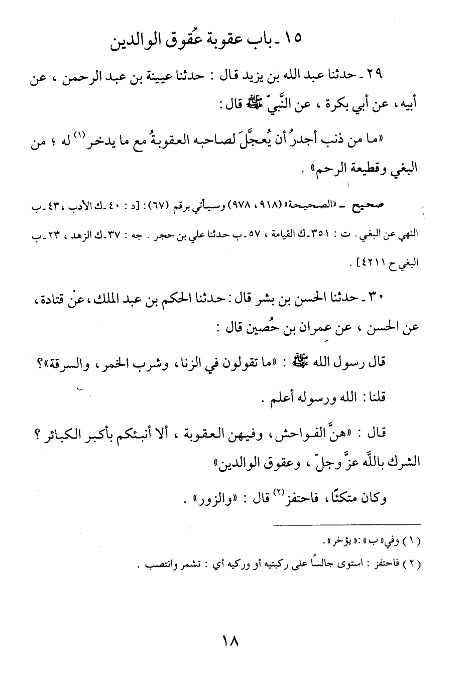 30 - عن عمران بن حصين - رضي الله عنه - قَالَ: قَالَ رَسُولُ اللَّهِ صَلَّى اللهُ عَلَيْهِ وَسَلَّمَ: (مَا تَقُولُونَ فِي الزِّنَا وَشُرْبِ الْخَمْرِ وَالسَّرِقَةِ؟) قُلْنَا اللَّهُ وَرَسُولُهُ أَعْلَمُ قَالَ: (هُنَّ الْفَوَاحِشُ وَفِيهِنَّ الْعُقُوبَةُ أَلَا أُنَبِّئُكُمْ بِأَكْبَرِ الْكَبَائِرِ الشِّرْكُ بِاللَّهِ عَزَّ وَجَلَّ وَعُقُوقُ الْوَالِدَيْنِ) وَكَانَ متكئا فاحتفز قال: (والزور)