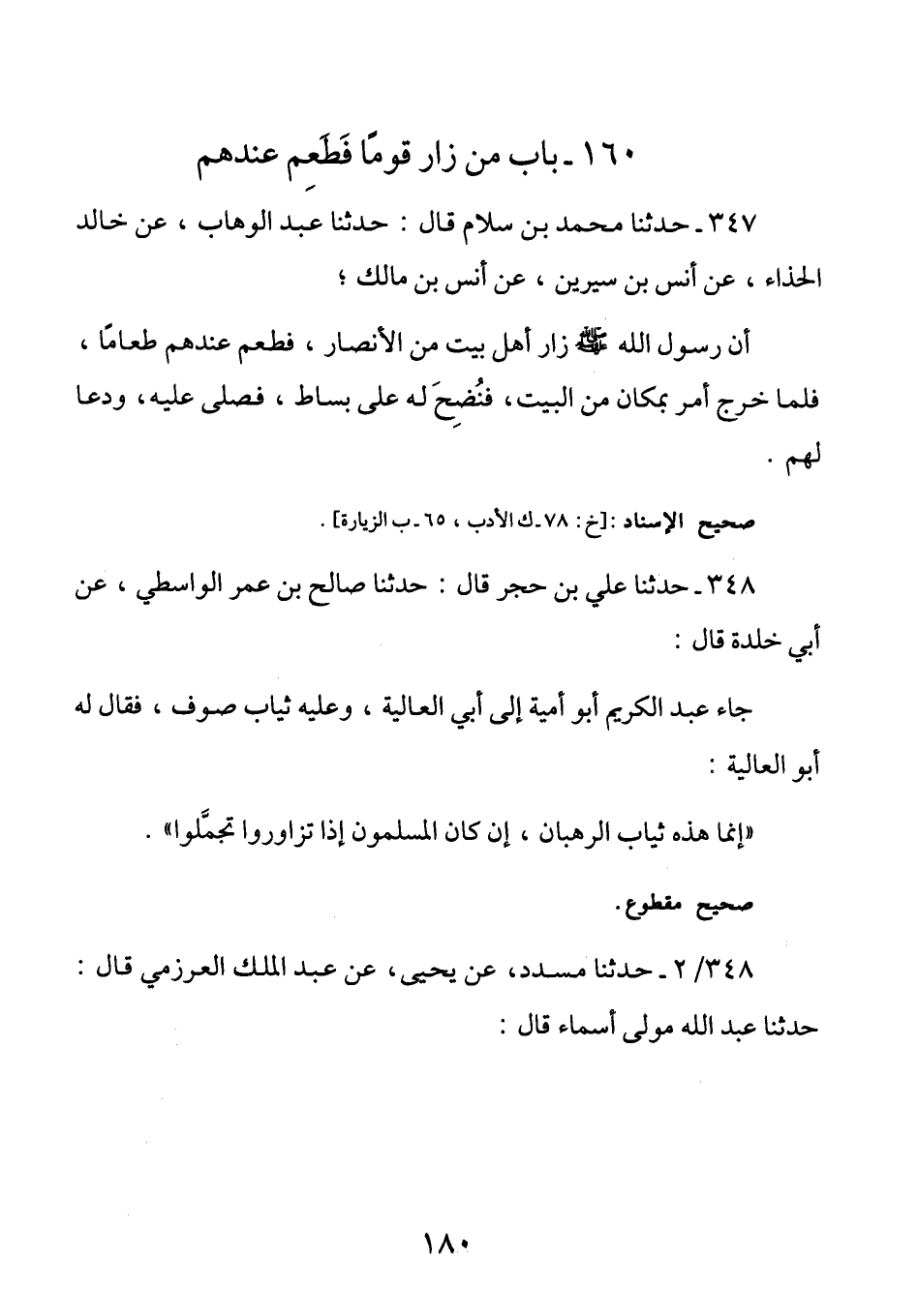 348 - (ث 87) عَنْ أَبِي خَلدةَ قَال جَاء عَبد الكَريم أَبو أُمَيةِ إِلَى أَبي العَالِيةِ وعَليه ثِيابُ صُوفٍ فَقَال: أَبُو العَالِية: إِنَّما هَذه ثِيابُ الرُّهْبَان، إِنْ كَانَ المُسلِمُونَ إِذا تَزاوَرُوا تَجَمَّلُوا.
