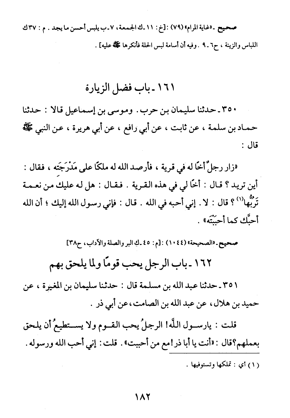 350 - عَنْ أَبِي هُرَيْرَةَ رَضِيَ اللَّهُ عَنْهُ عَن النَّبِيِّ صَلَّى اللهُ عَلَيْهِ وَسَلَّمَ قَالَ: (زَار رَجلٌ أَخًا لَه فِي قَرية فَأرصد اللَّهُ لَه مَلَكاً عَلى مَدرجَتِه (¬1) ، فَقال: أَينَ تُريدُ؟ قَال: أَخًا لِي فِي هَذه القَريةِ. فَقال هَل لَه عَليكَ مِن نِعمةٍ تَرُبُها (¬2) ؟ قالَ: لَا إِني أُحِبُه فِي اللَّهِ. قَال فَأِني رسولُ اللَّهِ إِليكَ أنَّ اللَّهَ أَحَبَكَ كَما أَحبَبتَهُ)