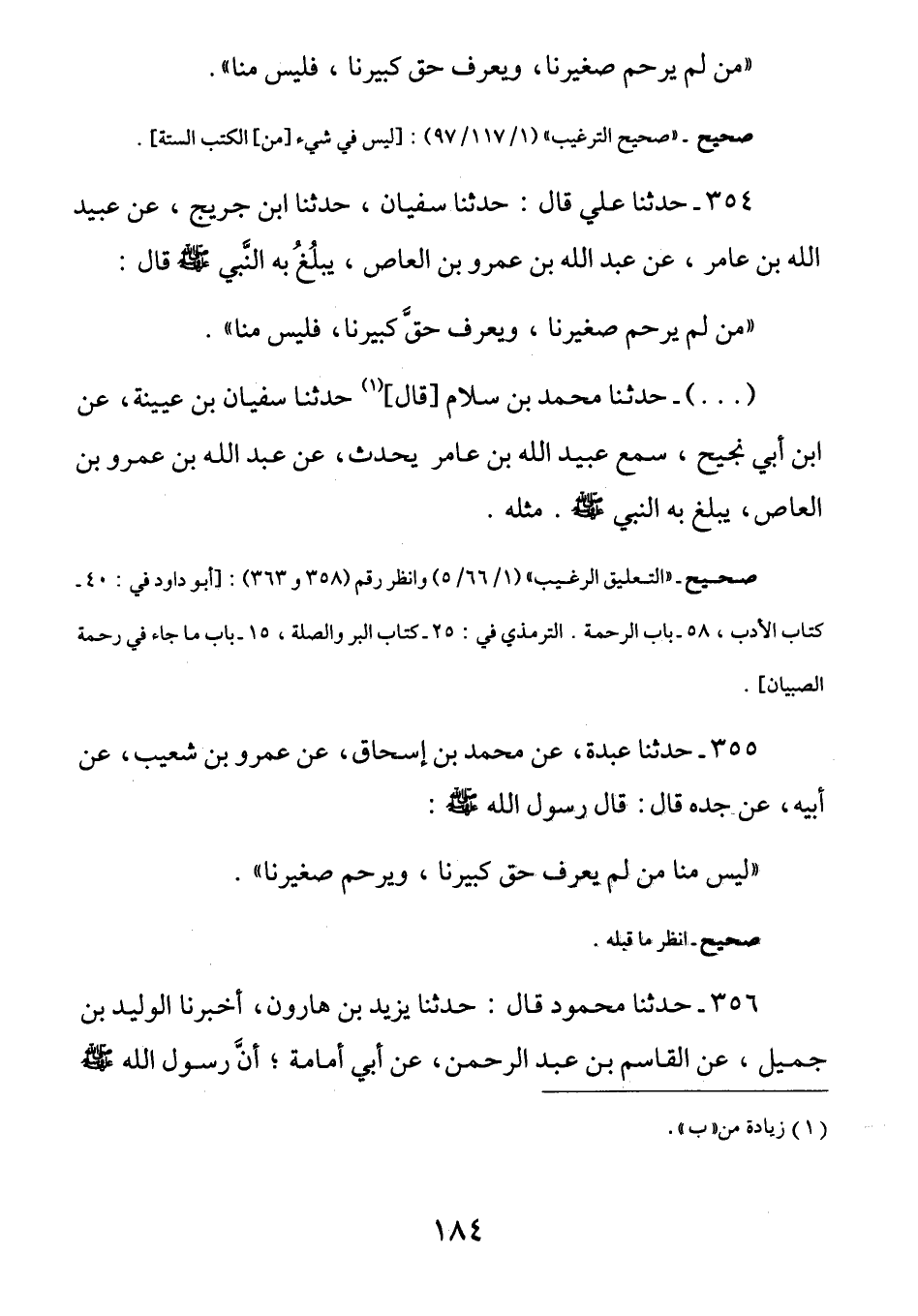354 - عَنْ عَبْدِ اللَّهِ بْنِ عَمْرِو بْنِ الْعَاصِ - رضي الله عنهما - يَبْلُغُ بِهِ النَّبِيَّ صَلَّى اللهُ عَلَيْهِ وَسَلَّمَ قَالَ: (مَن لَم يَرحمْ صَغِيرنَا ويَعرف حَق كَبيرِنَا فَليسَ مِنَّا)