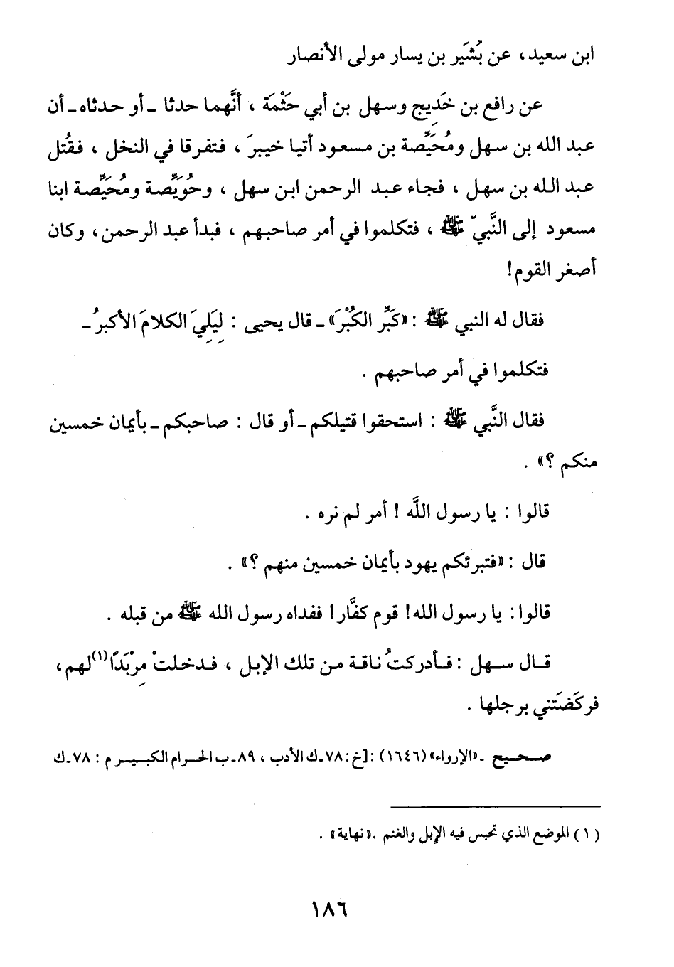 359 - عَنْ رَافِعِ بْنِ خَدِيجٍ وَسَهْلِ بْنِ أَبِي حَثمَة أنهما حَدثا، أَنَّ عَبد اللَّهِ بْنَ سَهل ومُحَيصة بْنَ مَسْعُودٍ أَتَيا خَيبرَ، فَتفَرقَا فِي النَّخلِ، فَقُتِل عَبْدُ اللَّهِ بْنُ سَهْلٍ، فَجاءَ عَبْدُ الرَّحْمَنِ بْنُ سَهْلٍ وحُويِصة ومُحَيصة ابْنَا مَسعود إِلَى النَّبِيِّ صَلَّى اللهُ عَلَيْهِ وَسَلَّمَ فَتَكَلمُوا فِي أَمرِ صَاحِبِهم ن فَبَدأ عَبد الرَّحْمَنِ وكَان أَصغرَ القومِ فَقال لَهُ النبيُ صَلَّى اللهُ عَلَيْهِ وَسَلَّمَ: (كَبِّر الكُبَر) قَالَ يَحْيَى: لِيَلىَ الكلامَ الأكبرُ) فَتكلمُوا فِي أمْرِ صَاحِبهم فَقال النَّبِيُّ صَلَّى اللهُ عليه وسلم: (أَتستَحِقون قَتِيلكُم - أَوْ قَالَ - صَاحِبكُم بَأيمَان خَمسين مِنكُم؟) قَالُوا: يَا رَسُولَ اللَّهِ أَمرٌ لَم نَرهُ. قَالَ: (فَتُبرِئُكم يَهود بَأيمانِ خَمسينَ مِنُهم؟) قَالُوا: يا رسول الله قَومٌ كُفار، فَوداهَم رسول الله صلى الله عليه وسلم مِن قِبَلِه. قَالَ سَهْلٌ: فَأدركتُ نَاقةً مِن تِلك الإبلِ فَدخلتُ مِربَداً (¬1) لَهم فَركَضَتنِي بِرجلِها.