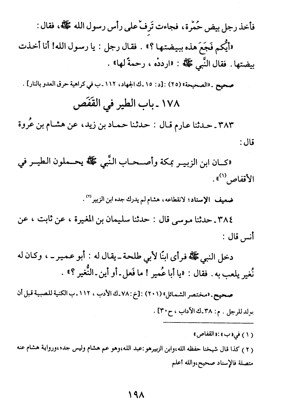 383 - (ث 94) عَنْ هِشَامِ بْنِ عُرْوَةَ قَالَ: كَانَ ابْنُ الزُّبَيْرِ بِمكة وَأَصْحَابُ النَّبِيِّ صَلَّى اللهُ عَلَيْهِ وسلم يَحمِلون الطَّيرَ فِي الأقفَاص.