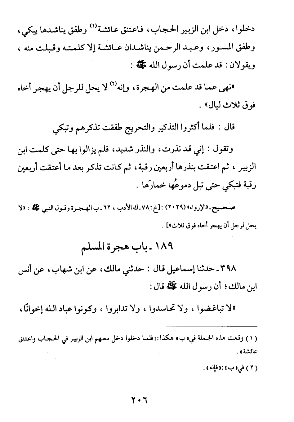 دَخلُوا دَخل ابْنُ الزُبير فِي الحِجاب واعتَنقَ عائشةَ وطَفِقَ يُناشِدُها يَبكِي، وطَفِق المِسورَ وَعَبْدُ الرَّحْمَنِ يُناشِدان عَائشة إِلَّا كَلمَتهُ وقَبِلتْ مِنهُ ويقولان: قَد عَلمت أنَّ النَّبِيَّ صَلَّى اللهُ عَلَيْهِ وَسَلَّمَ نَهى عمَّا قَد عَلمتِ مِنَ الهِجرة وأَنهُ لَا يَحلُ لمُسلم أَنْ يَهجُر أخاهُ فَوق ثَلاث لَيالٍ. قَالَ: فَلما أَكثروا التَذكِير والتَحريجَ طَفقتْ تُذكِّرهُم وتَبكي، وَتَقُولُ: إِني قَد نَذرتُ والنَّذرُ شَديد فَلم يَزالا بِها حَتى كَلمتْ ابْنَ الزُّبَيْرِ ثُم أَعتقت فِي نَذرهَا أَربعينَ رَقبةً ثُم كَانت تَذكرُ بَعدمَا أَعتقت أربعينَ رَقبةً فَتبكِي حَتى تَبُلَّ دُموعُها خِمارُها.