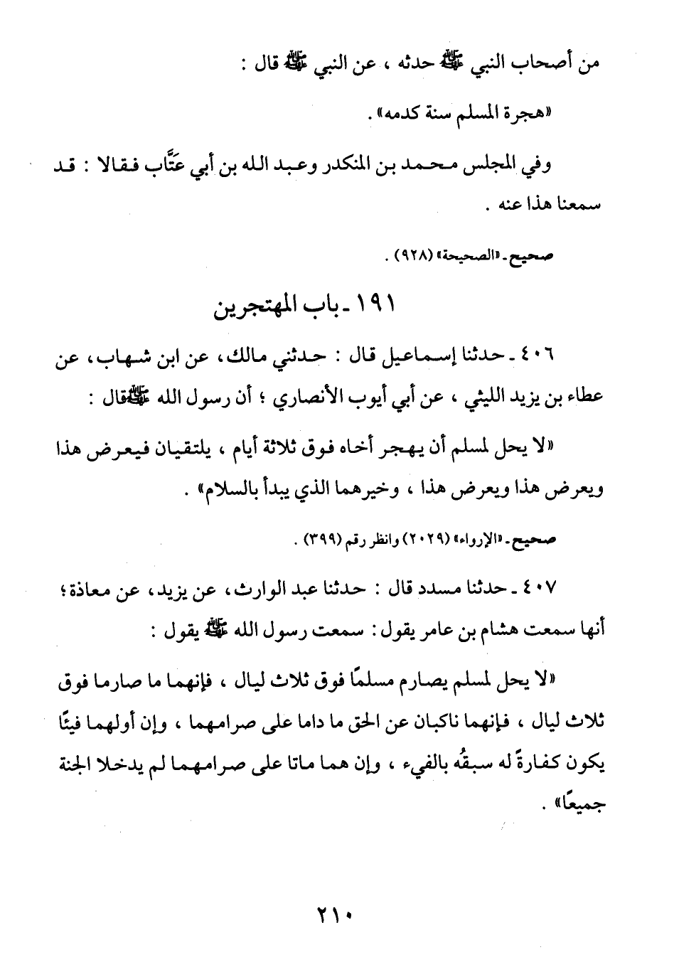 406 - عن أبي أيوب الأنصاري رَضِيَ اللَّهُ عَنْهُ أَنَّ رَسُولَ اللَّهِ صَلَّى الله عليه وسلم قَالَ: (لَا يَحلُ لِمسلمٍ أنْ يَهجُر أَخاه فَوق ثَلاثةِ أَيام يَلتقِيان فَيعرِضُ هَذا ويُعرضَ هَذا وخَيرُهُما الَّذِي يَبدأُ بالسلام)