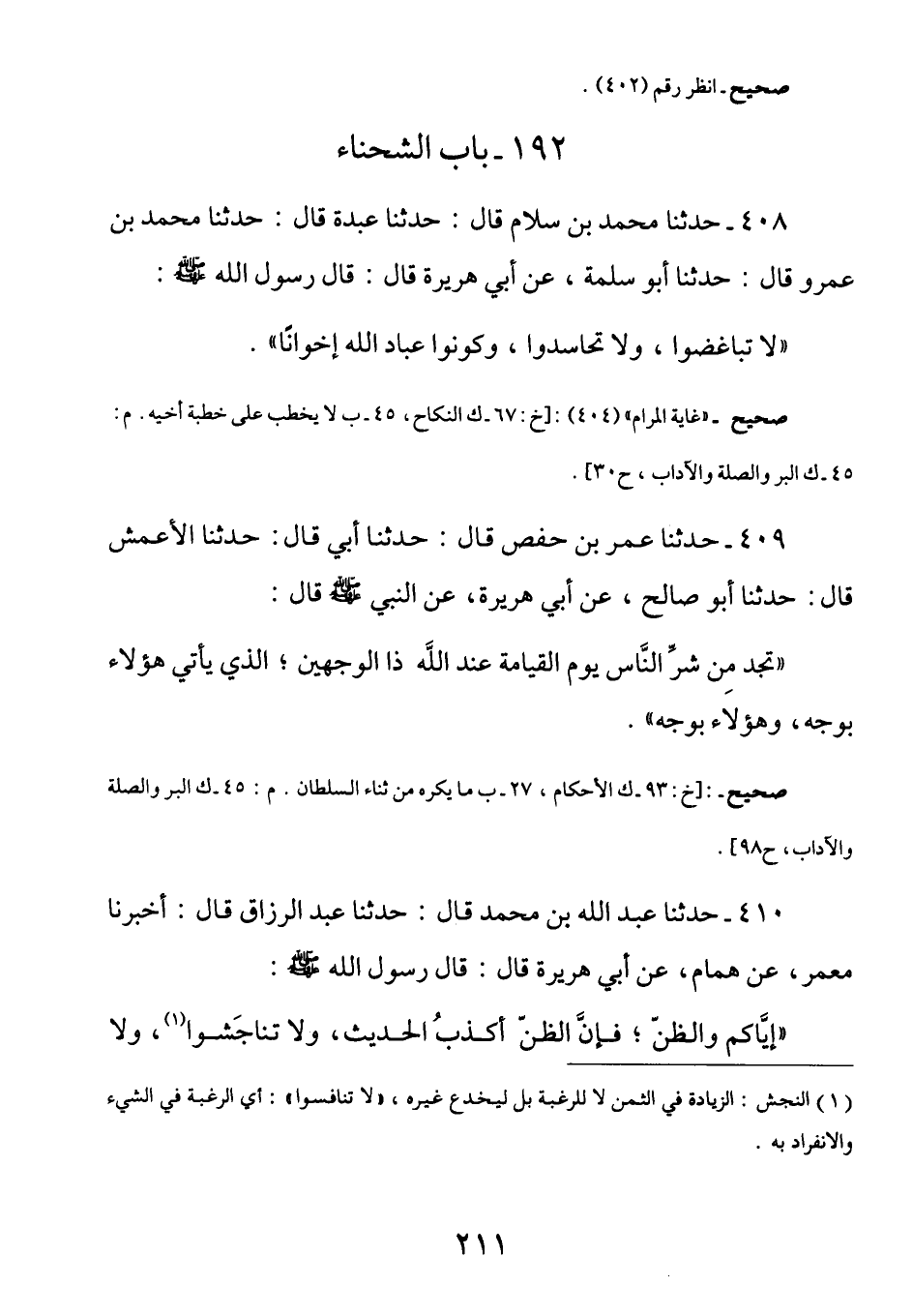 408 - عن أبي هريرة رضي الله عنه قَالَ: قَالَ رَسُولُ اللَّهِ صَلَّى اللهُ عَلَيْهِ وَسَلَّمَ: (لَا تَبَاغَضُوا وَلَا تَحاسَدُوا وكُونُوا عِبادَ الله إخواناً)
