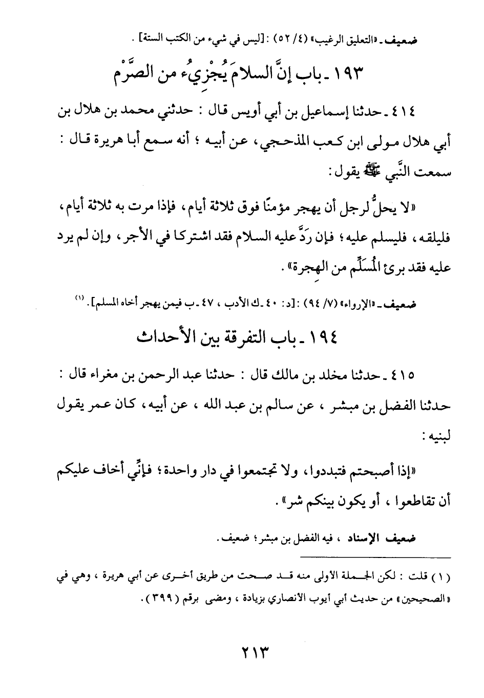 414 - عن أبي هريرة رضي الله عنه قَالَ: سَمِعْتُ النَّبِيَّ صَلَّى اللهُ عَلَيْهِ وَسَلَّمَ يَقُولُ: (لَا يَحِلُ لرجُلٍ أنْ يَهجُر مُؤمناً فَوق ثَلاثةِ أَيامٍ فَإذا مَرت ثَلاثةُ أَيامً فَليَلقَهُ فليُسَلِّم عَليهِ، فَإِنْ رَدَّ عَليه السَّلامَ فَقد اشتَركَا فِي الأجرِ، وإنْ لَم يَردَ عَليه فَقد بَريء المُسلم مِن الهِجرةِ)
