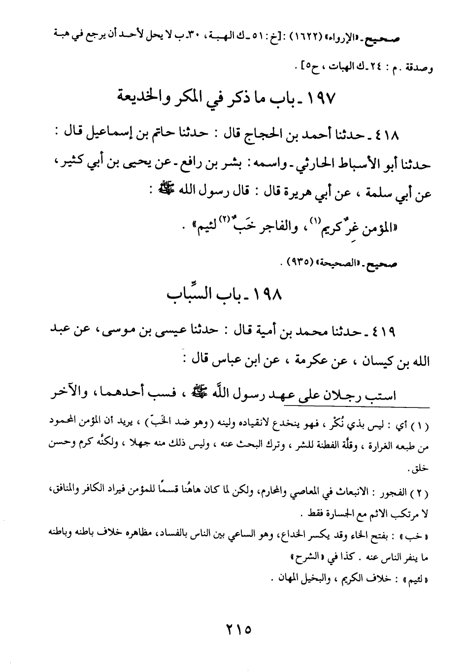 418 - ة عن أبي هريرة رضي الله عنه قَالَ: قَالَ رَسُولُ اللَّهِ صَلَّى اللهُ عَلَيْهِ وَسَلَّمَ: (الُمؤمنُ غِرٌ (¬1) كَريمٌ، والفَاجِرُ خَبٌ (¬2) لَئيمٌ)