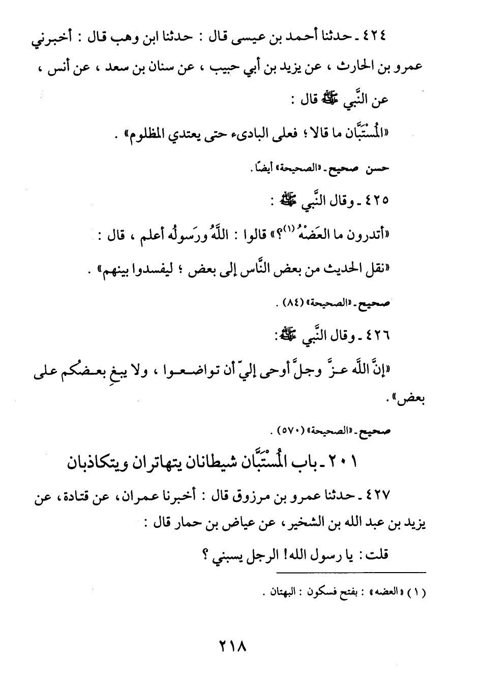 425 - وَقَالَ النَّبِيُّ صَلَّى اللهُ عَلَيْهِ وَسَلَّمَ: (أَتدرُونَ مَا العَضْهُ؟) قَالُوا: اللَّهُ وَرَسُولُهُ أَعلمُ، قَالَ: (نَقلُ الحَديثِ مِن بَعضِ النَّاسِ إِلَى بَعضٍ لِيُفسدُوا بَينَهم)