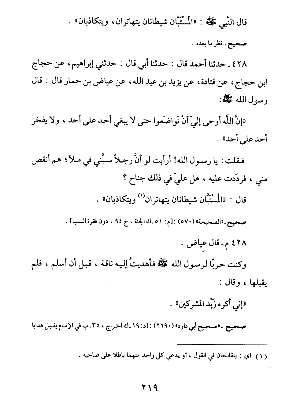 428 - قَالَ عِيَاضٌ وكنتُ حَرباً لِرَسُولِ اللَّهِ صَلَّى اللهُ عَلَيْهِ وَسَلَّمَ فَأهَديتُ إِليه نَاقةً قَبل أنْ أُسلِم فَلم يَقبَلها. وَقَالَ: (إِني أَكره زَبد المُشرِكِين)