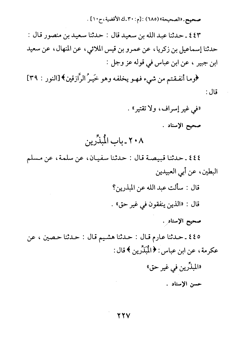 444 - (ث104) عَنْ أَبِي الْعُبَيْدَيْنِ قَالَ: سَألتُ عَبد اللَّهِ عَن (المُبذِرينَ) قَالَ: الَّذِينَ يُنفِقُون فِي غَير حَقٍ.