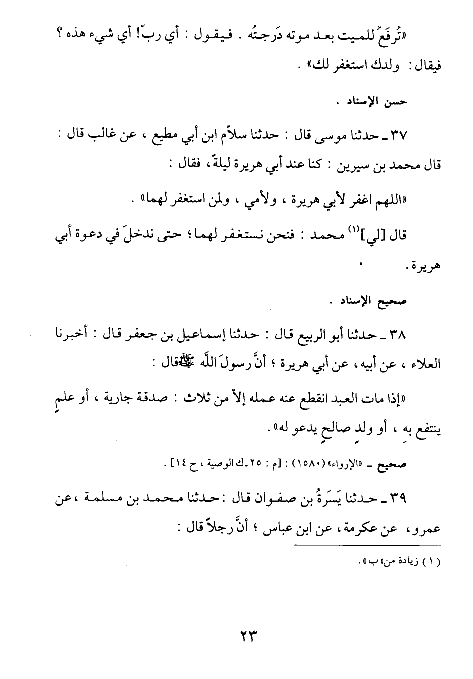 37 - (ث 13) عن محمد بن سيرين قال: كنا عند أبى هريرة - رضي الله عنه - لَيْلَةً، فَقَالَ: (اللَّهُمَّ اغْفِرْ لِأَبِي هُرَيْرَةَ وَلِأُمِّي ولمن استغفر لهما) قال مُحَمَّدٌ: فَنَحْنُ نَسْتَغْفِرُ لَهُمَا حَتَّى نَدْخُلَ فِي دعوة أبى هريرة.