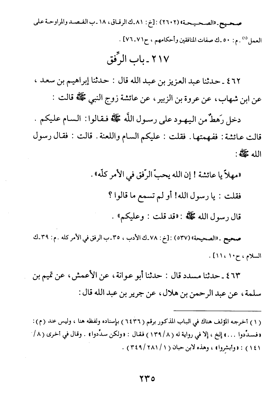 462 - عَنْ عَائِشَةَ زَوْجِ النَّبِيِّ صَلَّى اللهُ عَلَيْهِ وَسَلَّمَ قَالَتْ: دَخلَ رهطٌ مِن اليهودِ عَلَى رَسُولِ اللَّهِ صَلَّى اللهُ عَلَيْهِ وَسَلَّمَ فَقالوا: السَّامُ عَليكم. قَالَتْ عَائِشَةُ: فَفهِمتُها فَقلتُ: عَليكمُ السَّام واللعنَةُ. قَالت: فَقَالَ رَسُولُ اللَّهِ صَلَّى اللهُ عَلَيْهِ وَسَلَّمَ: (مَهلاً يَا عَائِشَةُ إنَّ اللَّهَ يُحبُ الرِّفقَ فِي الأمرِ كُله) فَقلتُ: يَا رَسُولَ اللَّهِ أَو لَم تَسمع مَا قَالُوا؟ قَالَ رَسُولُ اللَّهِ صَلَّى اللهُ عَلَيْهِ وَسَلَّمَ: (قَد قُلتُ وعَليكُم)