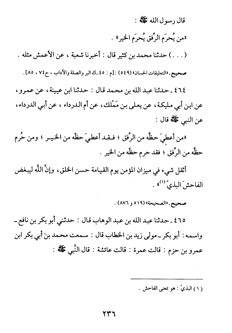 464 - عن أبي الدرداء رَضِيَ اللَّهُ عَنْهُ عَنِ النَّبِيِّ صَلَّى اللهُ عَلَيْهِ وَسَلَّمَ قَالَ: (مَن أُعطي حَظهُ مِن الرِّفقِ فَقد أُعطي حَظهُ مِن الخَير، ومَن حُرم حَظهُ مِن الرِّفق فَقد حُرمَ حَظهُ مِن الخَيرِ. أَثقلُ شَيء فِي مِيزانِ المُؤمنِ يَوم القِيامَةِ حُسنُ الخُلقِ، وإنَّ اللَّهَ ليُبغِضُ الفَاحِشَ البَذي)