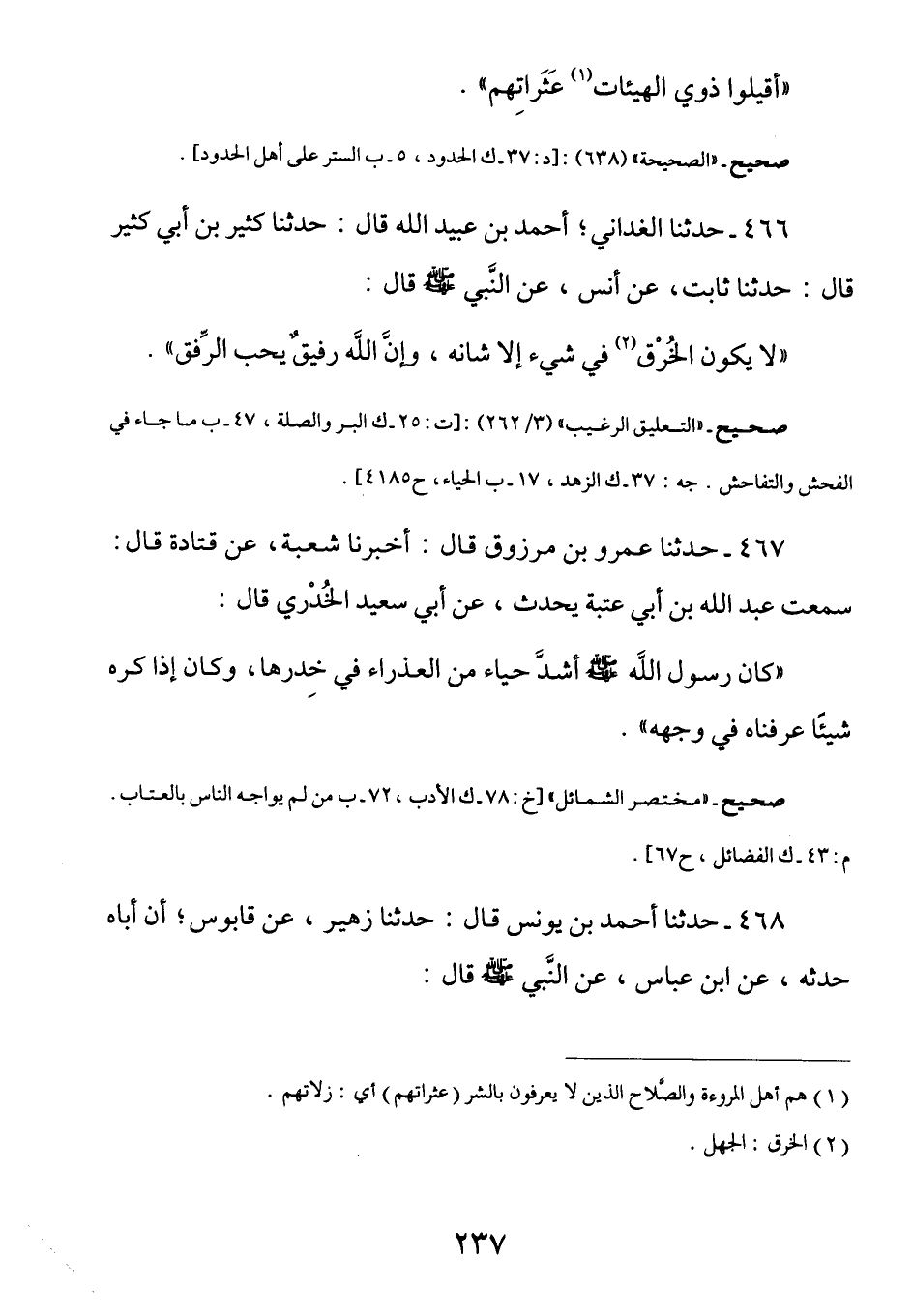 466 - عن أنس رَضِيَ اللَّهُ عَنْهُ عَنِ النَّبِيِّ صَلَّى اللهُ عَلَيْهِ وَسَلَّمَ قَالَ: (لَا يَكُونُ الخُرْقُ (¬1) فِي شَيءٍ إِلَّا شَانَهُ، وإنَّ اللَّهَ رَفيقٌ يُحبُ الرِّفقَ)