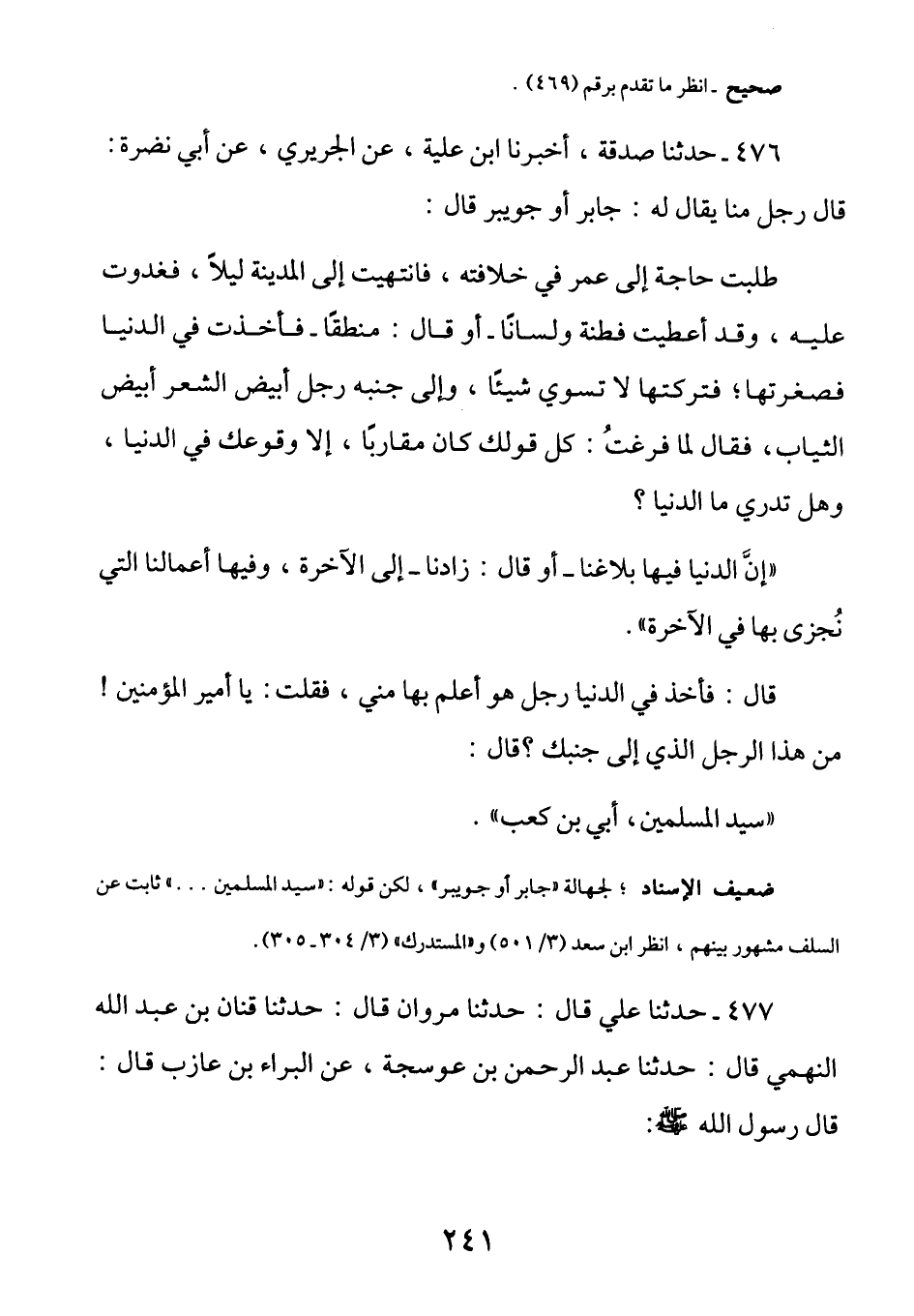 476 - (ث 112) عَنْ أَبِي نَضرةَ قَالَ رجلٌ مِنَّا يُقال لَه جَابرٌ أَو جُويبر: طلبتُ حَاجَةً إِلَى عُمرَ فِي خِلافتِه فانتهيتُ إِلَى المدينةِ لَيْلًا فَغدوتُ عَليه وقَد أُعطيتُ فِطنةً ولِساناً أَو قَال: مَنطِقاً فَأخذتُ فِي الدُّنيا فصغرتُها فَتَركتُها لَا تَسوىَ شَيْئًا وَإِلَى جَنبهِ رجلٌ أَبيضُ الشَّعر أَبيضُ الثيابِ فَقال لَما فَرغتُ: كُلَّ قَولِك كَانَ مُقارباً إِلَّا وقُوعكَ فِي الدُّنيا، وهَل تَدري مَا الدُّنيا؟ إنَّ الدُنيا فِيها بَلاغُنا أَوْ قَال: زَادُنَا إِلَى الآخِرةِ وفِيهَا أَعمالُنا الَّتِي نُجزَى بِها فِي الآخِرةِ، قَالَ: فَأخذَ فِي الدُّنيا رجلٌ هُو أَعلمُ بِهَا مِني، فَقلتُ: يَا أَميرَ المُؤمنينَ مَن هَذا الرَّجلُ الَّذِي إِلَى جَنبِك؟ قَال: سَيد المُسلمينَ أُبي بن كَعب.