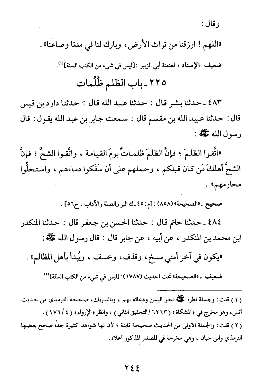 484 - عن جابر رضي الله عنه قَالَ: قَالَ رَسُولُ اللَّهِ صَلَّى اللهُ عَلَيْهِ وَسَلَّمَ: (يَكونُ فِي آخِر أُمَّتي مَسخٌ وقَذفٌ وخَسفٌ ويُبدأُ بِأهلِ المَظالِم) .