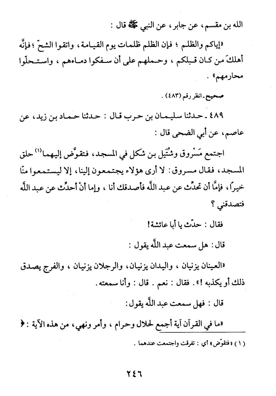 489 - (ث115) عَنْ أَبِي الضُحى قَالَ: اجتَمعَ مَسروقٌ وشُتَير بْنُ شَكَل فِي المَسجدِ فَتَقوضَ إِليهمَا حِلَقُ المَسجدِ فَقال مَسْرُوقٌ: لَا أَرى هَؤلاءِ يَجتمِعُون إِلينَا إِلَّا لِيستَمِعُوا مِنَّا خَيراً، فَإما أَن تُحدِّث عَن عَبْدِ اللَّهِ فَأُصدَّقَكَ أَنا، وإَمَّا أنْ أُحدثُ عَنْ عَبد اللَّهِ فَتُصدَّقَنِي. فَقالَ: حَدث يَا أَبَا عَائشةَ. قَال: هَل سَمعتَ عَبْدَ اللَّهِ يَقولُ: العينَان يَزنِيان، واليَدانِ يَزنِيان ون الرِّجلانِ يَزنِيان، والفَرجُ يُصدِّقُ ذَلك أَو يُكَذِّبُه؟ فَقَالَ: نَعم. قَالَ: وأَنا سَمِعتُه. قَالَ: فَهل سَمِعتَ عَبْدَ اللَّهِ يَقولُ: مَا فِي القُرآن آيةٌ أَجمعُ لِحلالٍ وحَرامٍ وأَمرٍ ونَهيٍ مِن هَذه الآية: