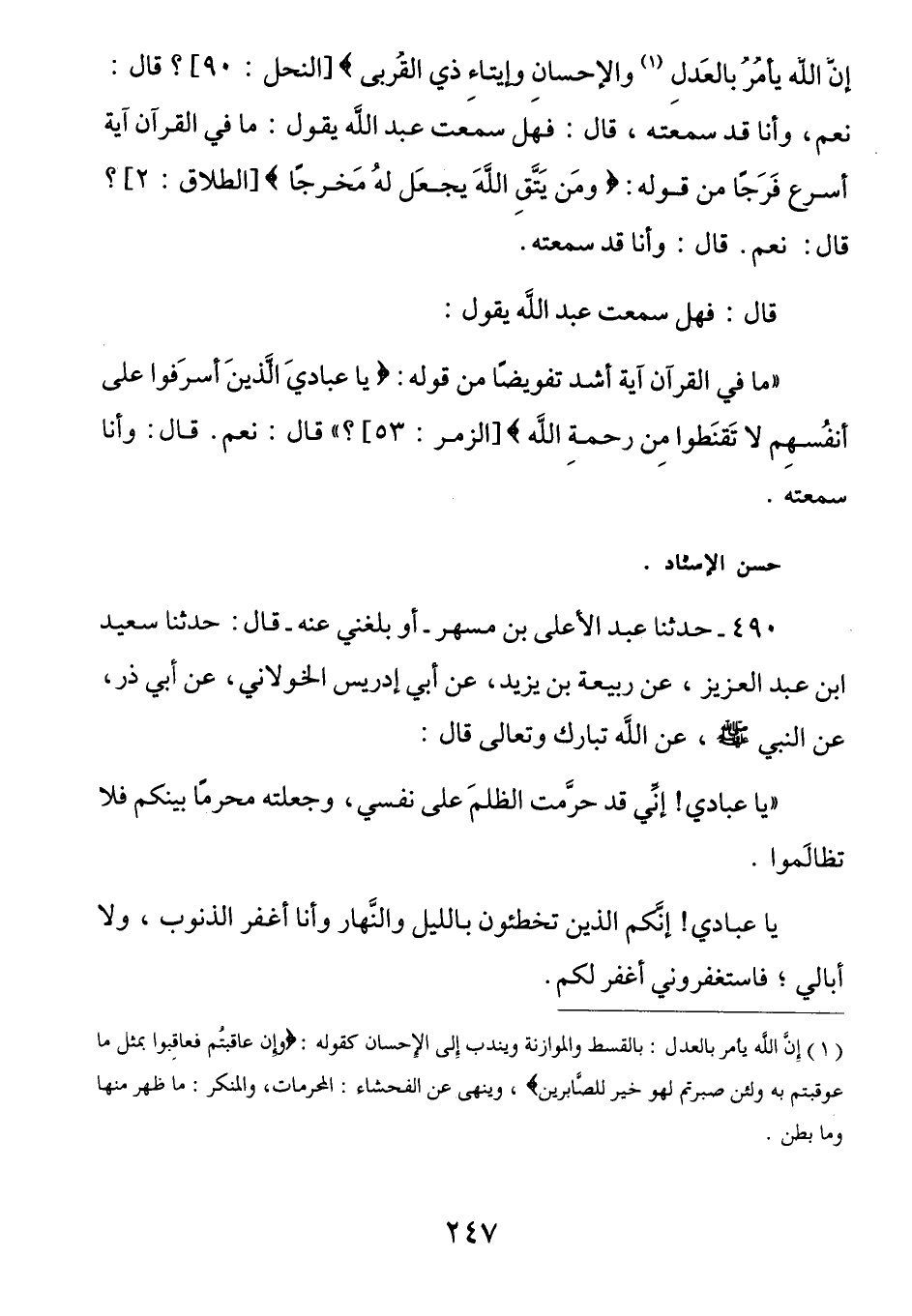 490 - عن أبي ذر رَضِيَ اللَّهُ عَنْهُ عَنِ النَّبِيِّ صَلَّى اللهُ عَلَيْهِ وَسَلَّمَ، عَنِ اللَّهِ تَبارك وتَعالى قَالَ: (يَا عِبادِي إِني قَد حَرمتُ الظُلمَ عَلى نَفسِي وجَعلتُهُ مُحرماً بَينَكُم فَلا تَظالَمُوا، يَا عِبادِي إِنَّكُم الذينَ تُخطِئُون بِالليلِ والنَّهَارِ وأَنا أَغفرُ الذُنُوبَ وَلَا أُبَالِي، فَاستَغفِروُنِي أَغفِر لَكُم.