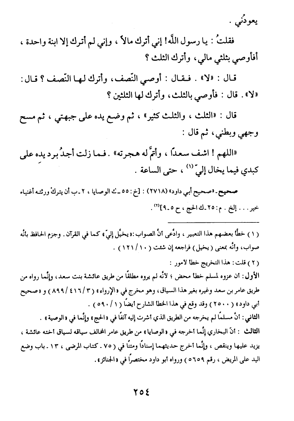 يَعودُني فَقلتُ: يَا رَسُولَ اللَّهِ إِنِّي أَتْرُكُ مَالًا، وَإِنِّي لَم أتْرُك إِلَّا ابْنَةً واحِدةً أَفأُوصِي بِثُلثَي مَالِي وأَتركُ الثُلثَ؟ قَالَ: (لَا) قال: أُوصِي بِالنصفِ وأَتركُ لَها النِّصفَ؟ قال: (لا) قُلت: فَأوصِى بالثُلث وأَتركُ لَها الثُلثَينِ؟ قَالَ: (الثُلثُ، والثُلثُ كَثيرٌ) ثُم وَضع يَدهُ عَلى جَبهَتِي ثُم مَسح وجهِي وبَطنِي ثُم قَالَ: (اللهمَّ اشفِ سَعداً وأَتِمَّ لَه هِجرتَهُ) فَما زِلتُ أَجدُ بَردَ يَدِه عَلى كَبِدي فِيما يَخالُ إليَّ حَتى السَاعَةَ) .