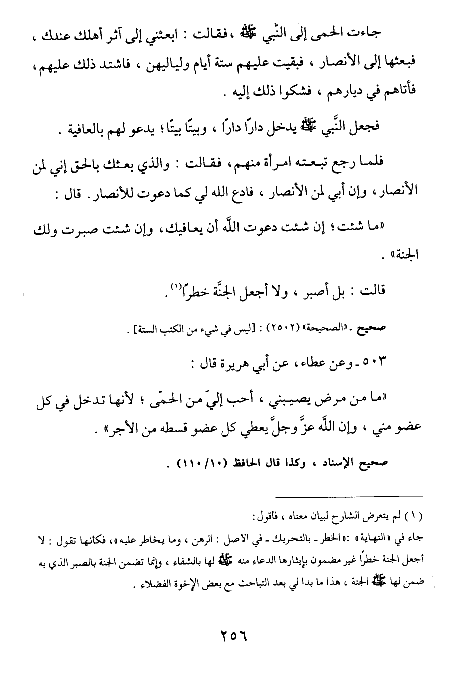 جَاءت الحُمَّى إِلى النَّبي صَلَّى اللهُ عَلَيْهِ وَسَلَّمَ فَقالتْ: ابعَثنِي إِلى آثَرِ أَهلِكَ عِندكَ فَبعثَها إِلى الأنصَارِ فَبقِيتْ عليهِم سِتةَ أَيامٍ ولَيالِيهِنَّ فَاشتَد ذلَك عَليهم فَأتاهُم فِي دِيارِهم فَشكُوا ذّلِك إِليهِ فَجعل النبيُ صَلَّى اللهُ عَلَيْهِ وَسَلَّمَ يَدخلُ دَارًا دَارًا وبَيتاً بَيْتًا يَدعُو لَهم بِالعَافِيةِ فَلما رَجعَ تَبعتَهُ امرأةٌ مِنهُم فَقالت: وَالَّذِي بَعثك بالحَقِ إِني لَمنَ الأنصَار وإنَّ أَبي لَمِنَ الأنصَارِ فَادع اللَّهَ لِي كَما دَعوتَ للأنَصارِ قَال: (مَا شِئتِ، إِن شِئتِ دَعوتُ اللَّهَ أَن يُعافِيك، وإِن شِئتِ صَبرتِ ولَكِ الجنَّة) قَالَتْ: بَل أَصبِر، ولا أَجعلُ الجَنةَ خَطَراً)