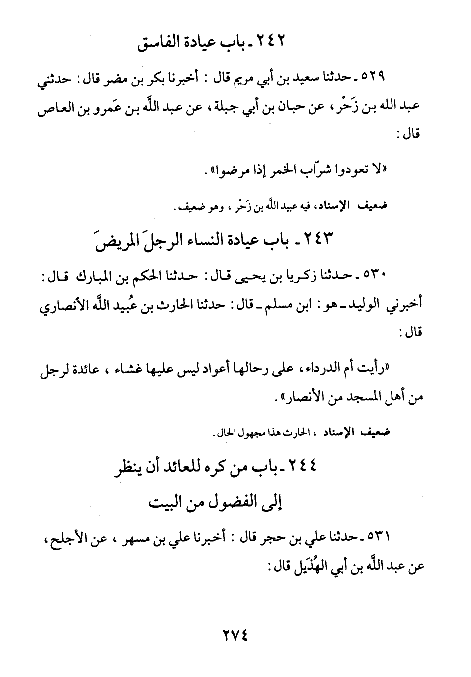 529 - (ث 127) عَنْ عَبْدِ اللَّهِ بْنِ عَمْرِو بْنِ الْعَاصِ رضي الله عنهما قَالَ: لَا تَعُودُوا شُرَّاب الخَمر إِذا مَرِضُوا.