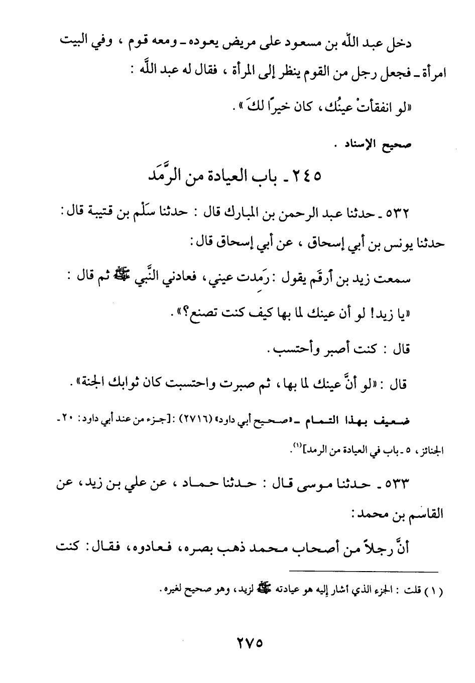532 - عن زيد بن أرقم رضي الله عنه قَال: رَمِدَتْ عَيني فَعادني النبيُ صَلَّى اللهُ عَلَيْهِ وَسَلَّمَ ثُم قَال: (يَا زيدُ لَو أنَّ عَينَكَ لَمَّا بِها كَيف كُنتَ تَصنَعُ؟) قَالَ: كُنتُ أَصبرُ وأَحتَسبُ. قَالَ: (لَو أنَّ عَينَكَ لَمَّا بِها ثُم صَبرتَ واحتَسبتَ كَان ثَوابُك الجَنَّةَ) .