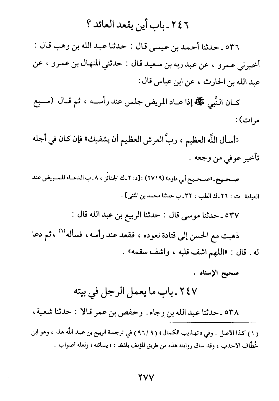 536 - عن ابن عباس رضي الله عنهما قَالَ: كَان النَّبِيُّ صَلَّى اللهُ عَلَيْهِ وَسَلَّمَ إِذا عَاد المَريضَ جَلسَ عِندَ رأسِه ثُم قَال (سَبع مِرَارٍ) : أَسألُ اللَّهَ العَظيمَ ربَّ العَرشِ العَظيم أنْ يَشفِيكَ) فَإن كَان فِي أَجلهِ تَأخِيرٌ عُوفِي مِن وَجَعِهِ.