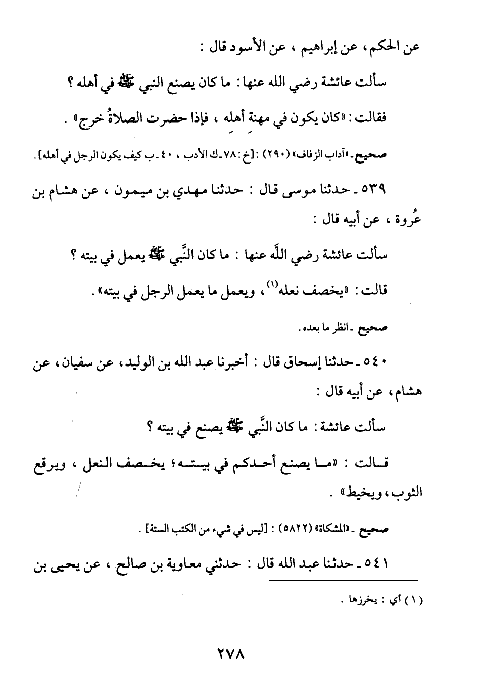 539 - عن ابن الزبير رضي الله عنهما قَالَ: سَألتَ عَائِشَةَ رَضِيَ اللَّهُ عَنْهَا مَا كانَ النَّبِيُّ صَلَّى اللهُ عَلَيْهِ وَسَلَّمَ يَعملُ فِي بيتِه؟ قَالَتْ: يَخصِفُ نَعله ويَعمل مَا يعملُ الرَّجُل فِي بَيتِهِ.