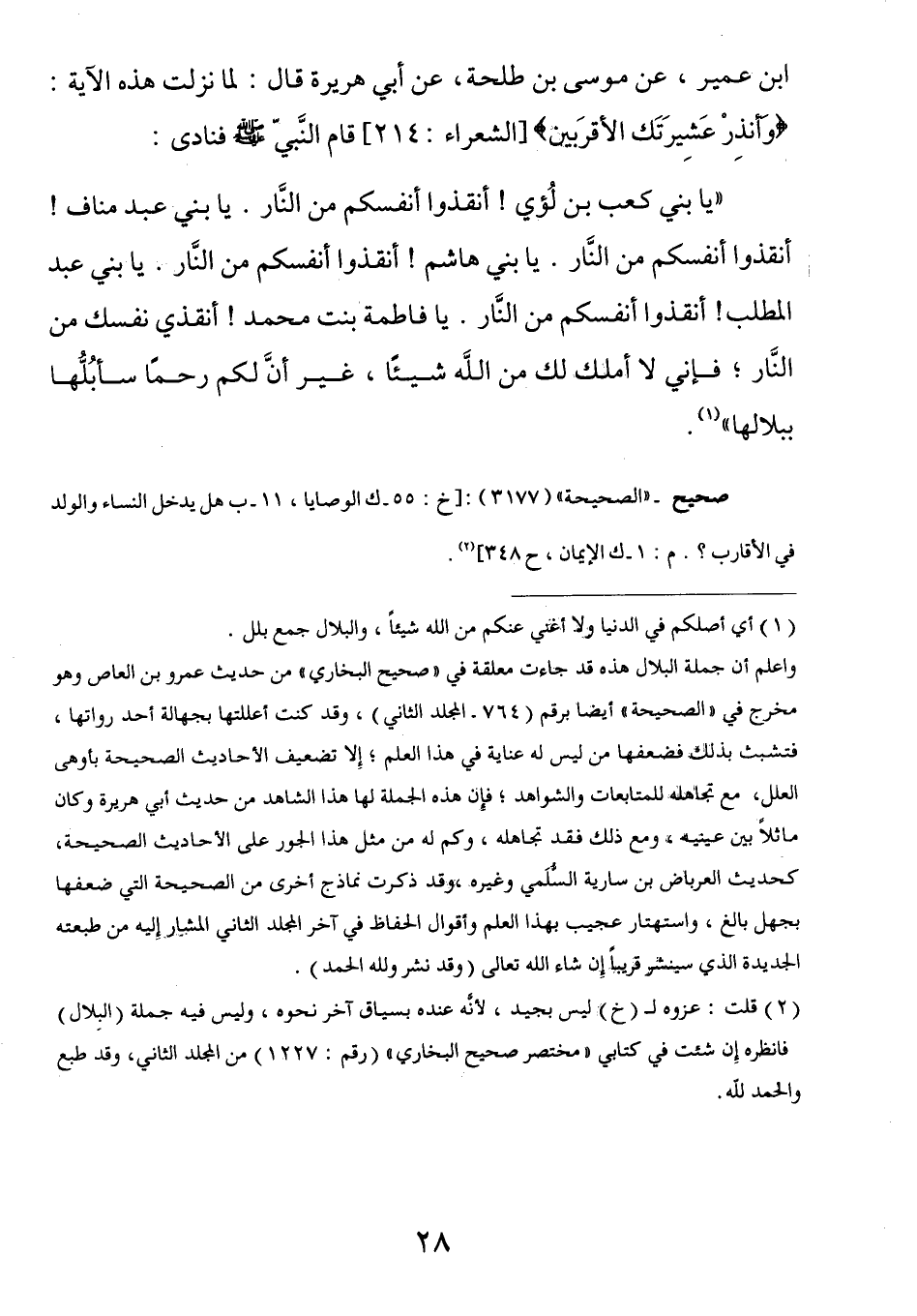 صحيح - «الصحيحة (3177) : [خ: 55 - ك الوصايا، 11 - ب يدخل النساء والولد في الأقارب؟ . م: 1-ك الإيمان، ح 348] (¬2) .
