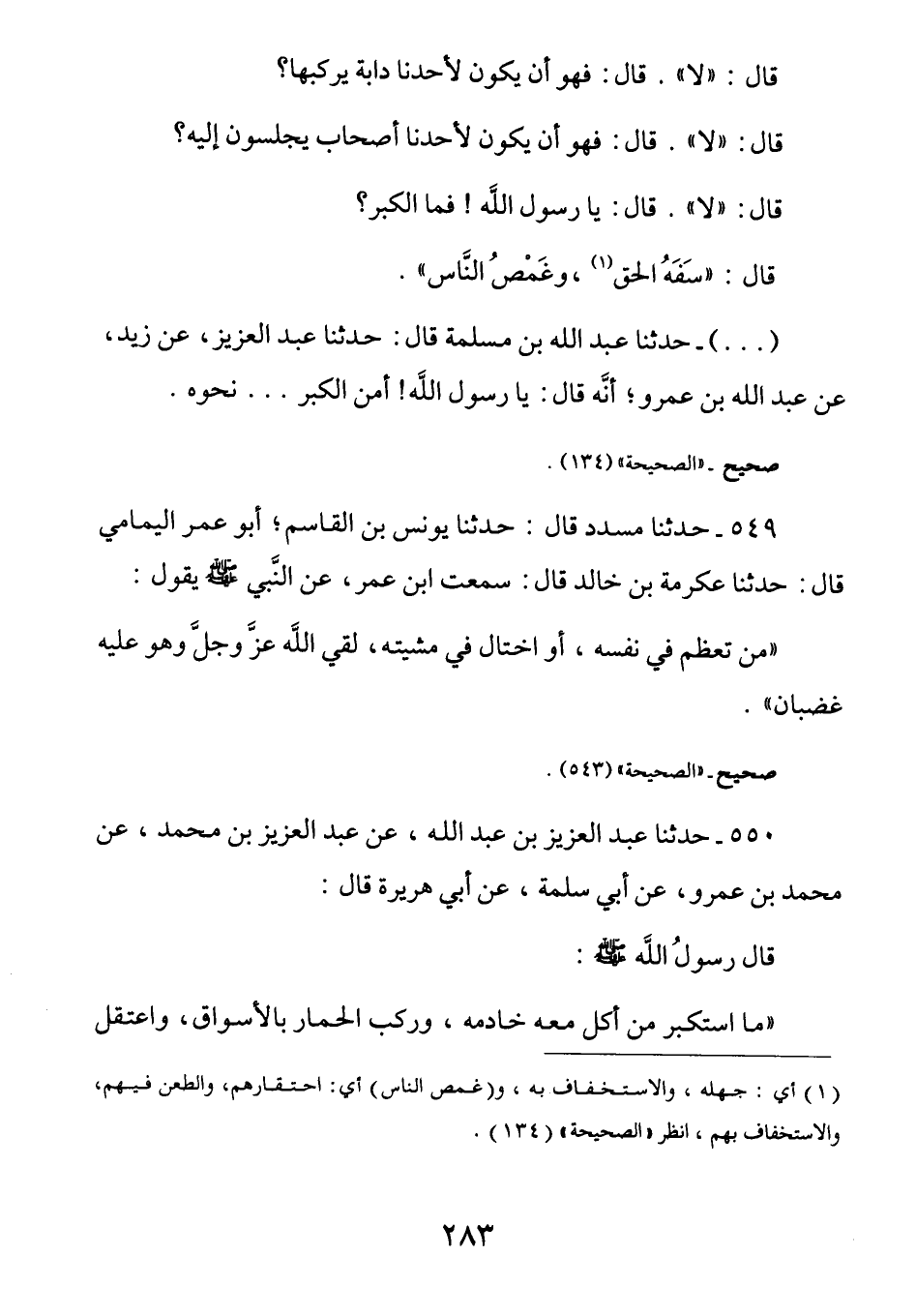 قَالَ: (لَا) قَالَ: فَهو أَنْ يَكون لأحدِنا دَابة يَركبُها؟ قَالَ: (لَا) قَالَ: فَهُوَ أَنْ يَكُونَ لأحَدِنَا أَصحابٌ يَجلسون إِليه؟ قَالَ: (لَا) قَالَ يَا رَسُولَ اللَّهِ فَمَا الْكِبْرُ؟ قَالَ: (سَفَهُ الحَق وغَمصُ (¬1) النَّاس)
