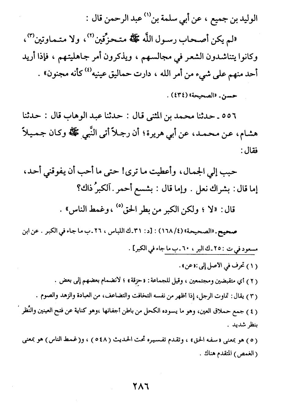 556 - عن أبي هريرة رضي الله عنه أَنَّ رَجُلًا أَتى النبيَ صَلَّى اللهُ عَلَيْهِ وَسَلَّمَ - وكَان جَميلاً - فَقال حُببَ إِلَيَّ الجَمالُ وأُعطيتُ مَا تَرى حَتى مَا أُحبُ أنْ يَفُوقَني أَحدٌ إمَّا قَال بِشرَاكِ نَعْلِ وَإِمَّا قَال: بشسعٍ أَحمرَ الكِبرُ ذَاكَ؟ قَال: (لَا ولَكنَّ الكِبرَ مَن بَطرَ الحَقَّ، وغَمِطَ النَّاسَ) .