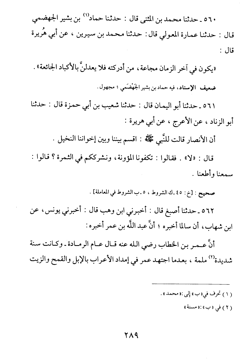 561 - عن أبي هريرة رضي الله عنه أَنَّ الْأَنْصَارَ قَالَتْ لِلنَّبِيِّ صَلَّى اللهُ عَلَيْهِ وَسَلَّمَ: اقسِم بَيننا وبَين إِخوانِنَا النَّخيل. قَالَ: (لَا) فَقالوا تَكفُونَا المَؤُونَة ونُشرِكُكُم فِي الثَمرةِ؟ قَالوا: سَمعنَا وأَطعنَا.
